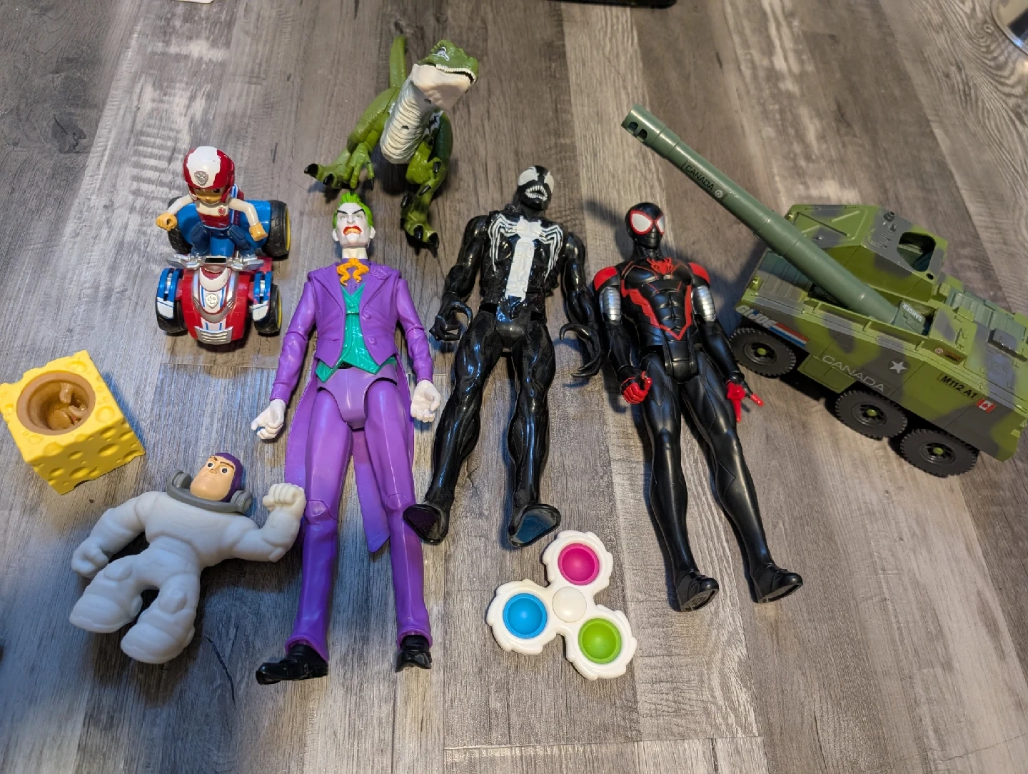 70A collection of action figures and toys for sale! Includes a Venom figure, Miles Morales Spider-Man, The Joker, Buzz Lightyear, a dinosaur, and a G.I. Joe tank. Perfect for kids or collectors!