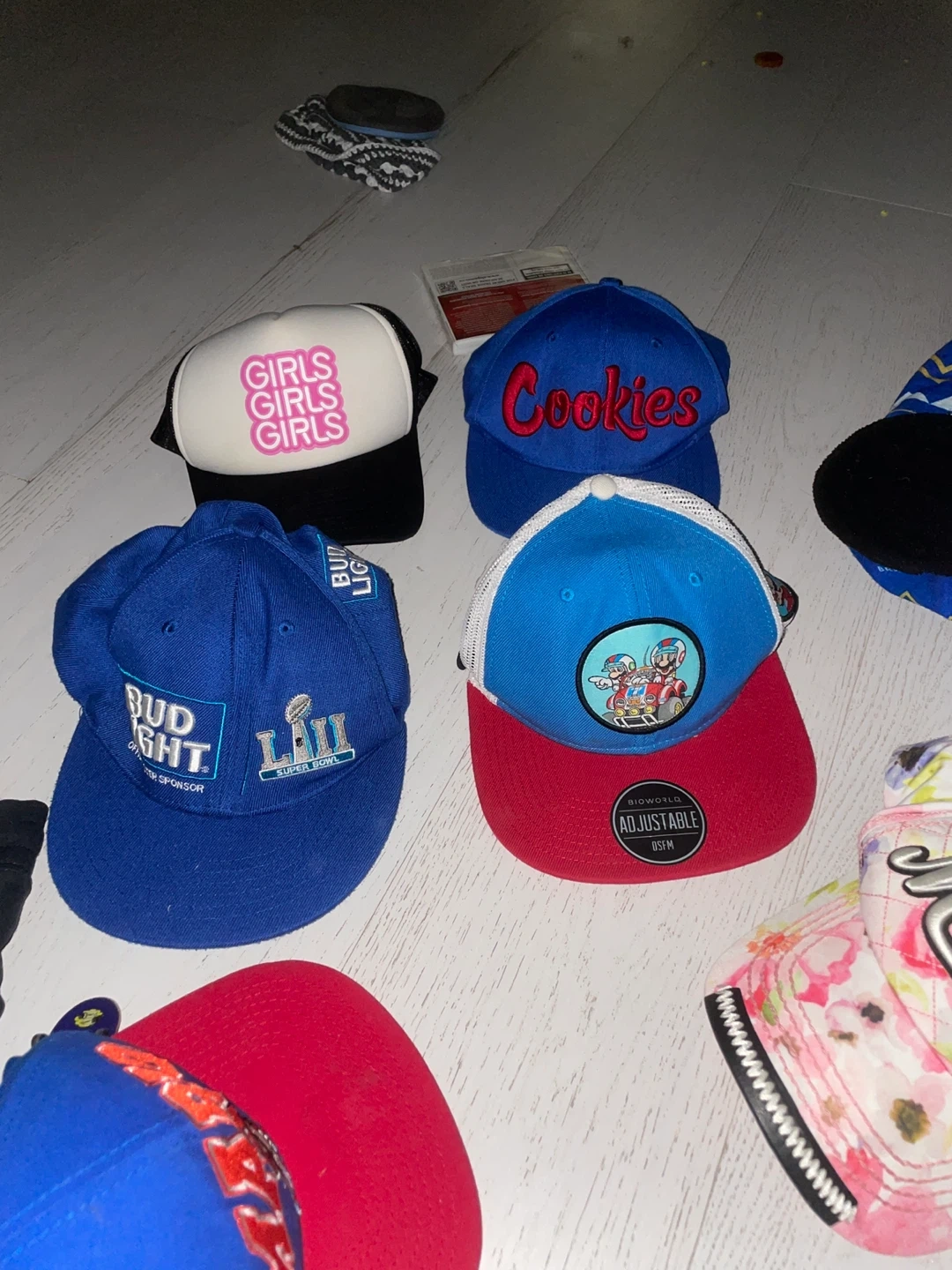 Selling a collection of baseball caps! There's a 'Cookies' cap, a 'Bud Light Super Bowl LII' cap, a 'Girls Girls Girls' cap, and a Bioworld adjustable cap. All in good condition and ready for a new home!