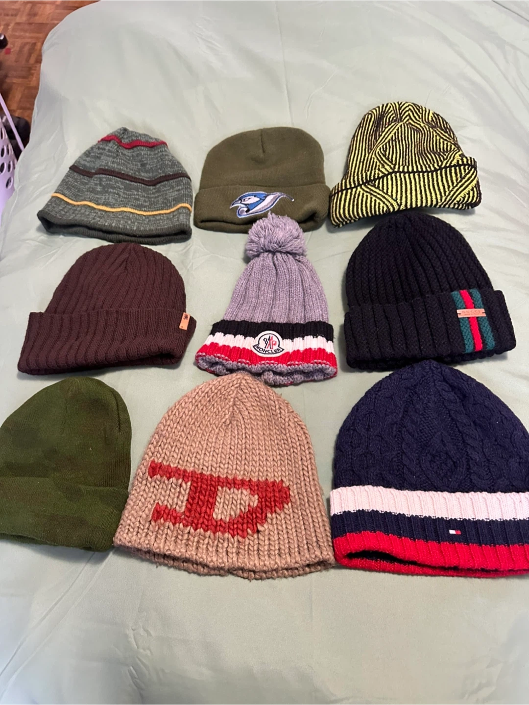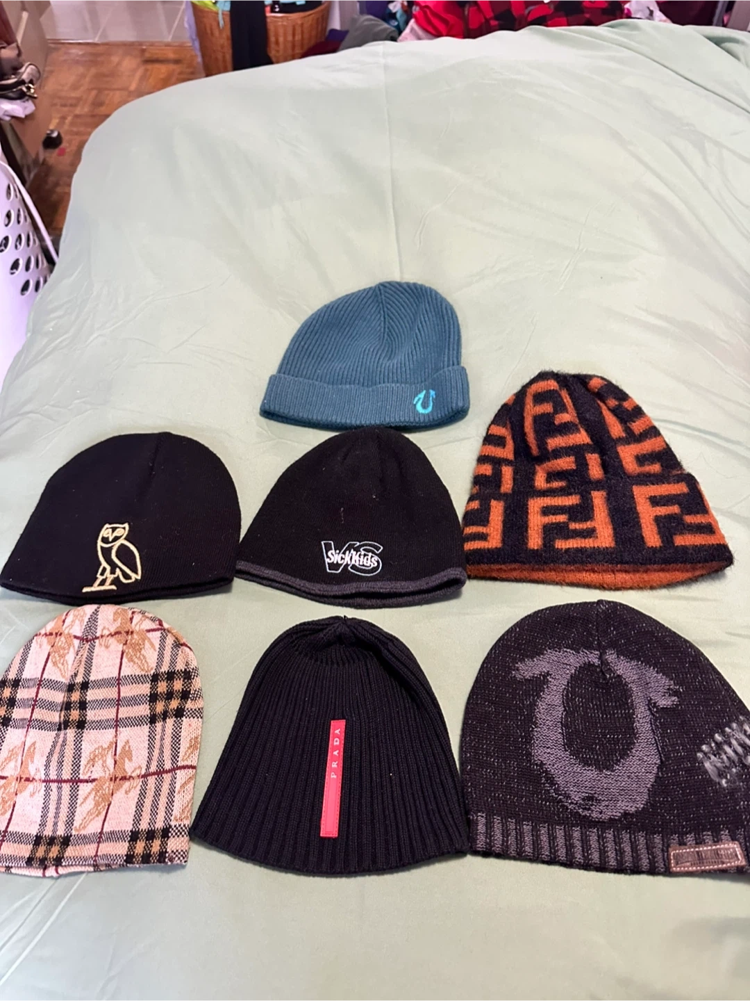 45Selling a collection of beanies from various brands. There's an OVO beanie, a Fendi beanie, a Burberry beanie, a Prada beanie, and a True Religion beanie. All in good condition!