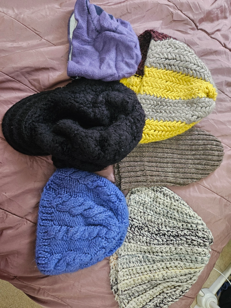Selling a lot of six assorted beanies! There's a variety of colours and styles to choose from. Perfect for keeping warm this winter season!