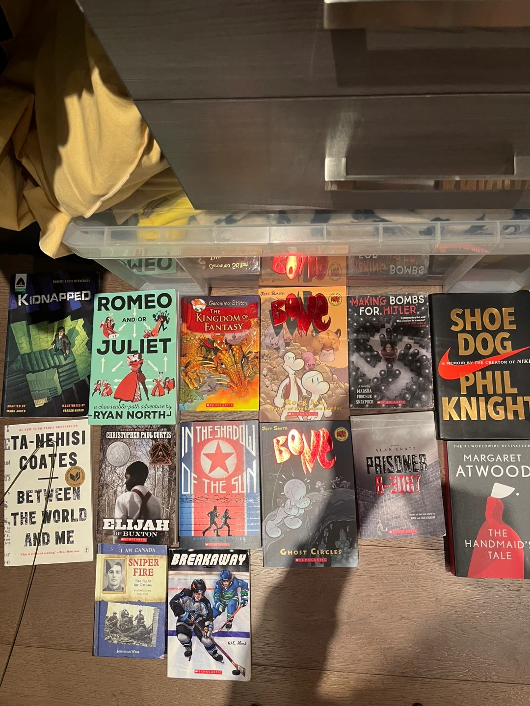 Selling a collection of books in good condition! Titles include: - Kidnapped by Robert Louis Stevenson - Romeo and/or Juliet by Ryan North - The Kingdom of Fantasy by Geronimo Stilton - Bone - Making Bombs for Hitler by Marsha Forchuk Skrypuch - Shoe Dog by Phil Knight - Between the World and Me by Ta-Nehisi Coates - Elijah of Buxton by Christopher Paul Curtis - In the Shadow of the Sun - Bone: Ghost Circles - Prisoner B-3087 by Alan Gratz - The Handmaid's Tale by Margaret Atwood - Sniper Fire - Breakaway by W.C. Mack Starting from $5 per book
