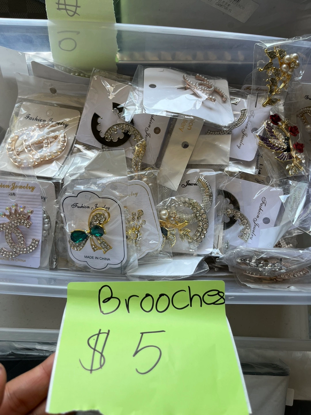 Selling a variety of fashion brooches! They're all individually packaged and ready to add some sparkle to your outfit. Lots of different styles to choose from, including floral, pearl, and rhinestone designs. Each brooch is $5.