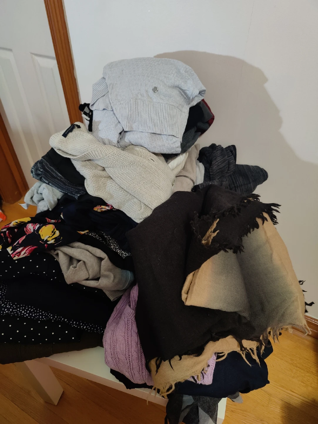 1000+There are various items such as scarves, skirts, dresses, gym pants, dress shirts, sweaters, cardigans, T-shirts, hoodies, etc. I don’t have enough time to take photos of each item, so please message me if you’re interested. It would be the fastest if you could come and take a look in person to choose what you like. Sizes: XS–M (a few items in L) Price: Free (for those who purchase at least one item) – $5 Discounts available for multiple purchases. Brands: Zara, Talula, Wilfred, BananaRepublic, Jones NY, Lululemon, UNIQLO, American Eagle, Bench, Lucky brand, H&M, Adidas, Champion, Reebok, Merrell, etc