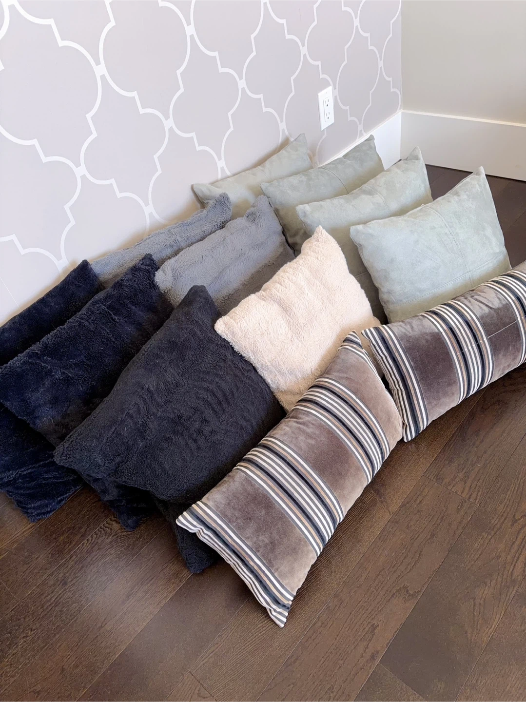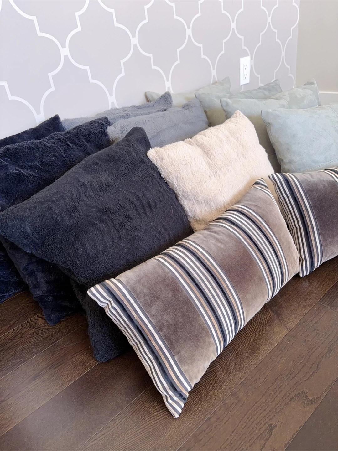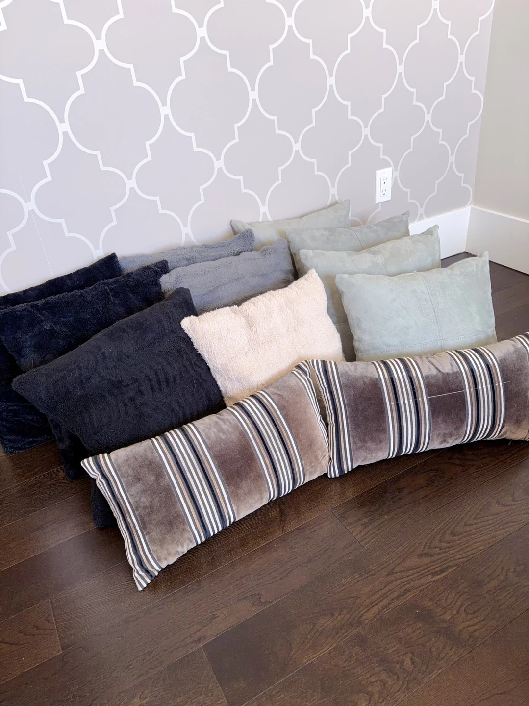 Selling a collection of decorative pillows in various colours and patterns. They're perfect for adding a touch of style to any room. The set includes black, gray, white, teal, and green-patterned pillows with different textures and designs. They are in great condition and ready for a new home. Selling as a lot - not sold separately.