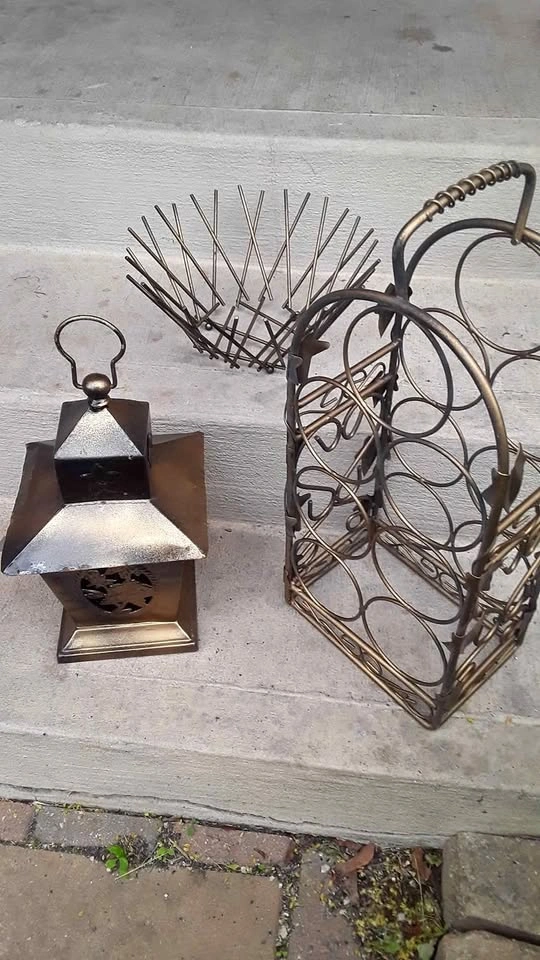 1 x wine display 1 x Fruit basket 1 x Lantern All pcs have been tastefully been refreshed with a coat of antique bronze