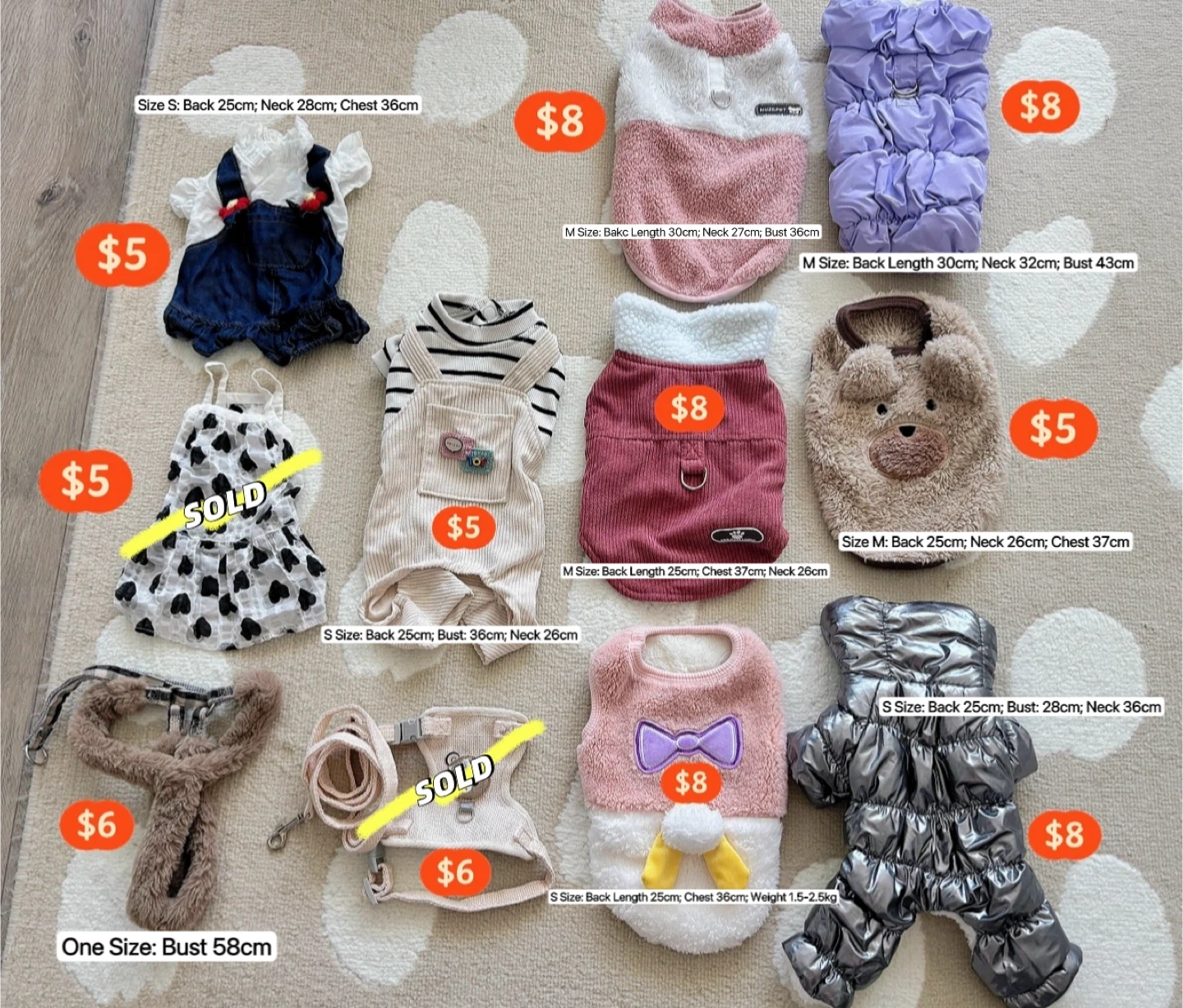 Selling dog clothes and harnesses. I have dresses, overalls, sweaters, and puffer jacket. Prices and size are marked in the photos. They are all in great condition. Pick up in dt Toronto, cash only