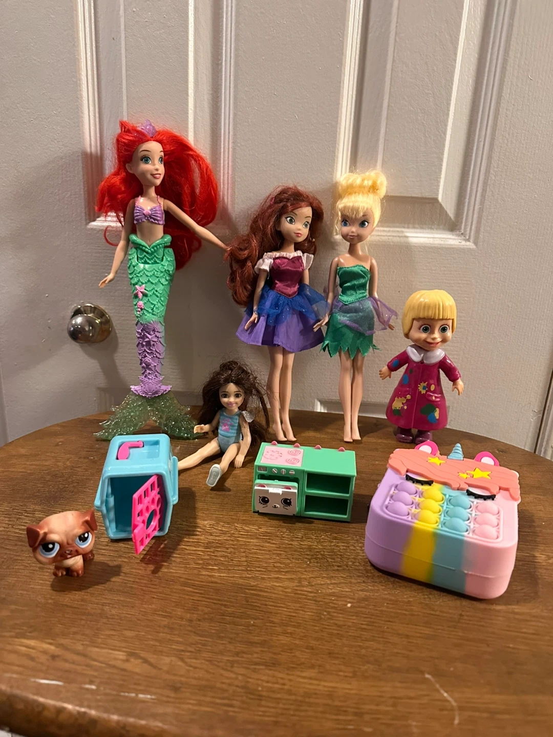 Selling a collection of dolls and mini toys! Includes Disney Princess dolls (Ariel, Tinkerbell), a Masha doll, a Littlest Pet Shop figure, a Shopkins mini oven, and a rainbow Pop It purse
