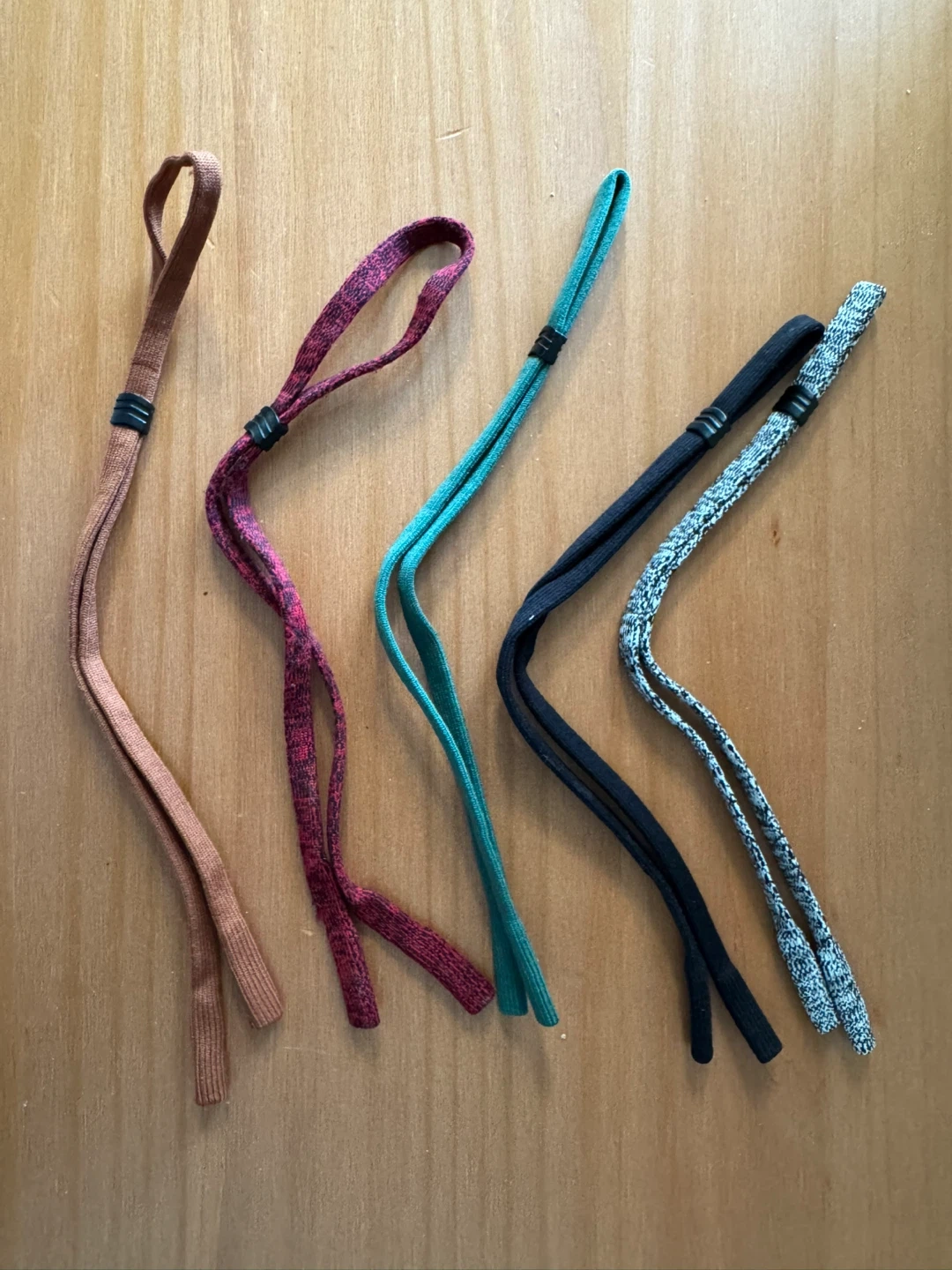 Selling a set of four eyeglass retainer straps! These are great for keeping your glasses secure during activities. The set includes straps in brown, pink/red, teal, and black/grey. They're adjustable for a comfortable fit!