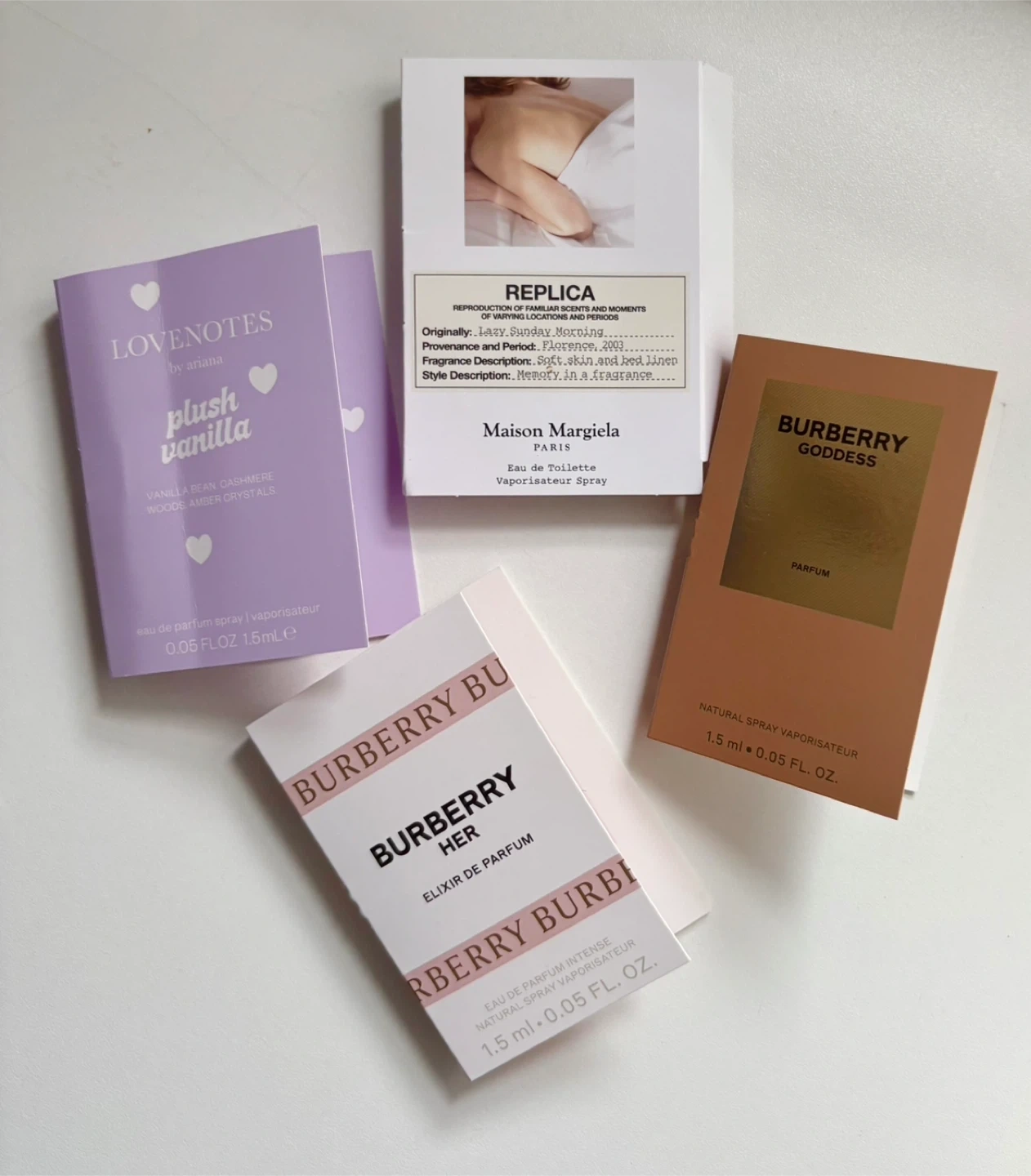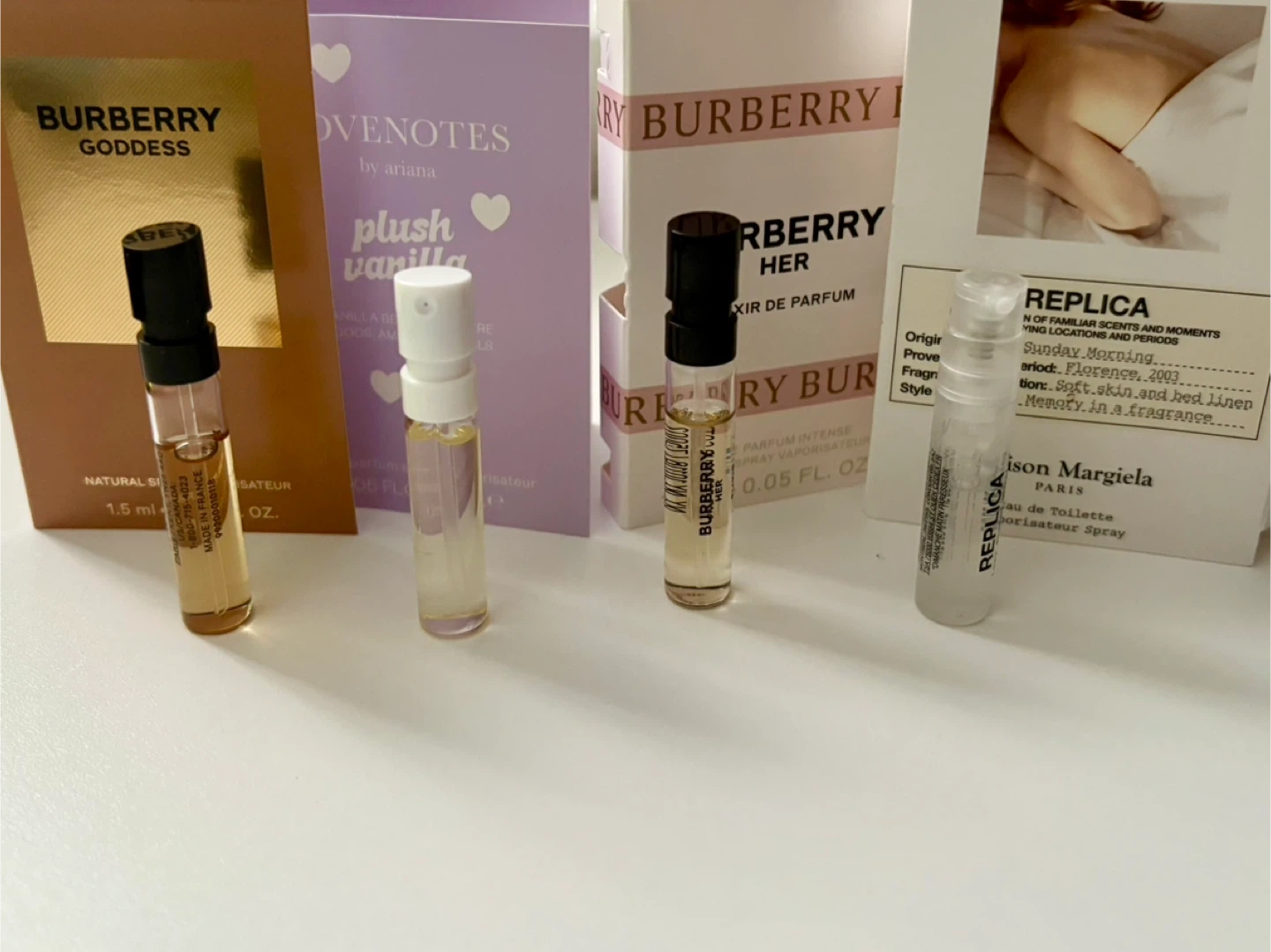 Selling a set of assorted perfume samples. Includes: - Burberry Goddess (1.5 ml) - Burberry Her Elixir de Parfum (1.5 ml) - Maison Margiela Replica Lazy Sunday Morning - Ariana Grande Lovenoates Plush Vanilla (0.05 fl oz) Never used Total - approx 5-6 ml Perfect to try on Price is non negotiable Cash only Pick up please
