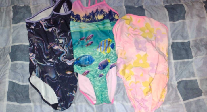 Selling a set of three gently used girls' swimsuits in size 10/12 They feature fun and colourful designs, perfect for the pool or beach! One has a cool galaxy print, another has a tropical fish theme, and the third has a cute floral pattern