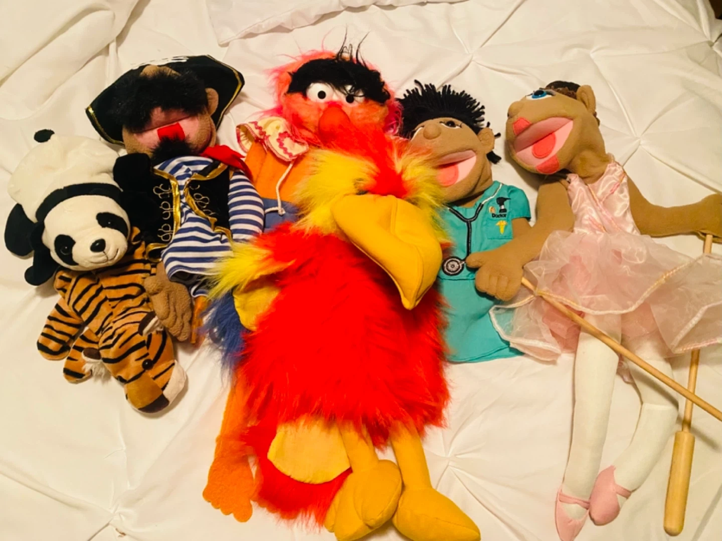 Selling a collection of fun hand puppets! Includes a panda, pirate, colourful parrot, doctor, and ballerina puppet. Great for imaginative play and storytelling! 4-Melissa and Doug collection. $50 for the bunch