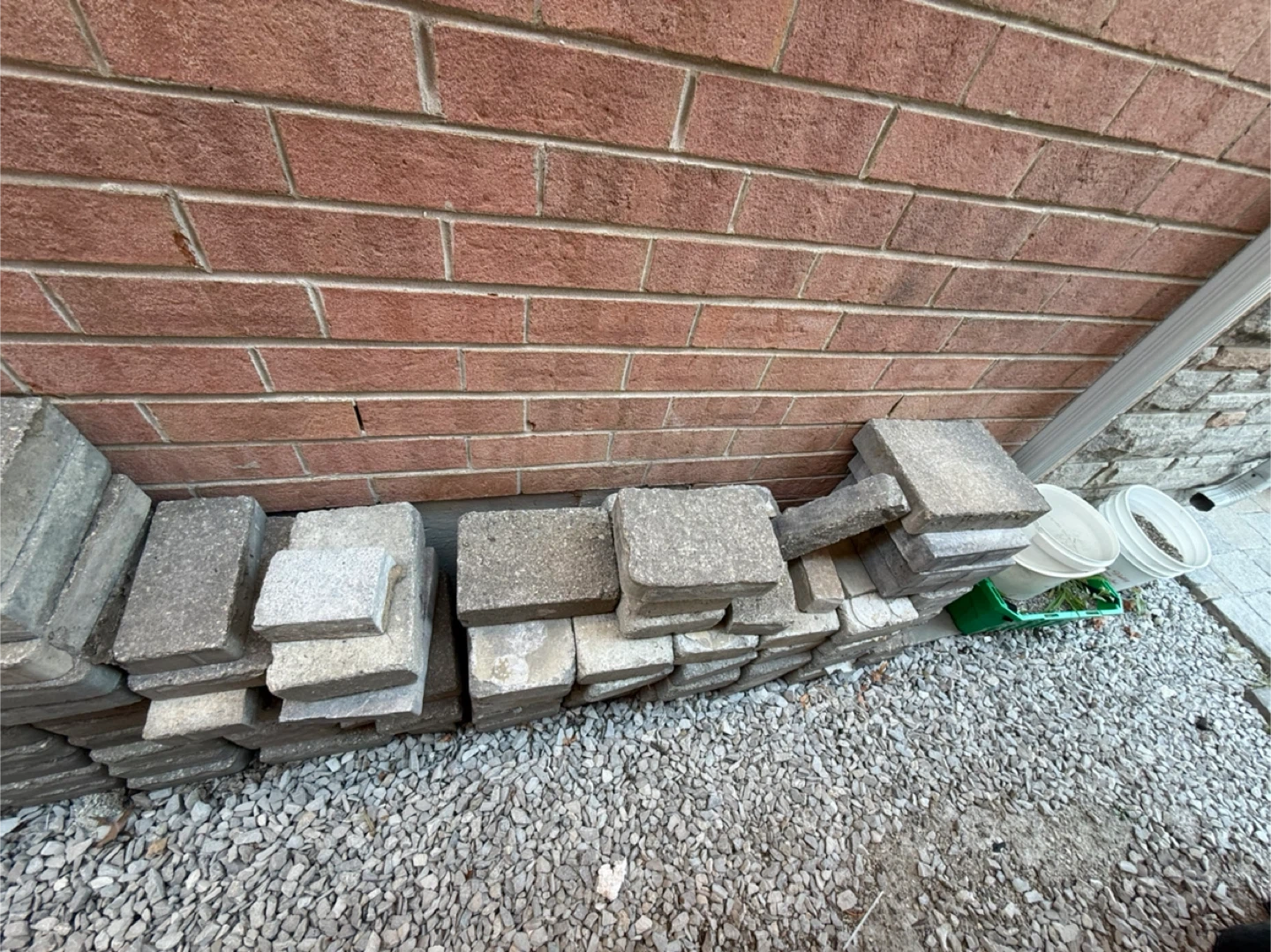 20 pieces of retaining wall block Approximately 60 ft.² of interlocking stones various sizes. Brown blend and grey blend Sell as is