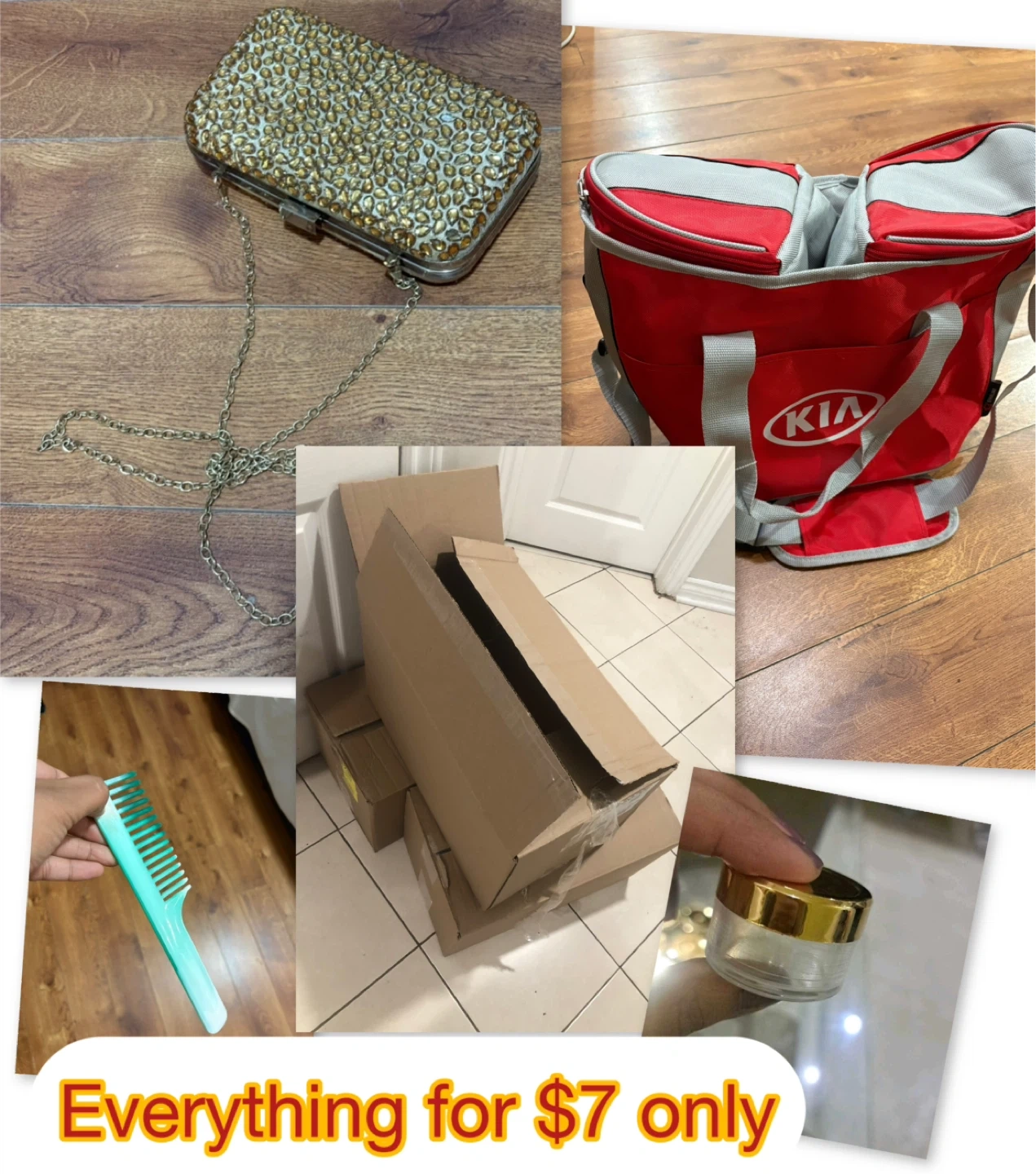 1000+Selling a collection of assorted items! Includes a beaded clutch, a KIA cooler bag, a comb, some boxes, and a small jar. Everything is available for just $7