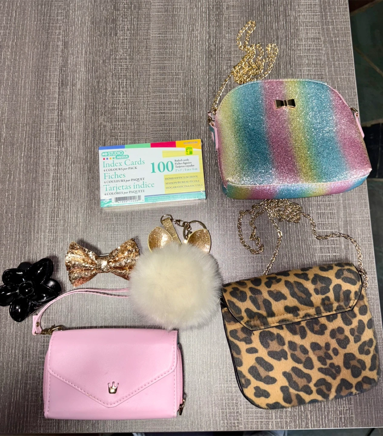 95Selling items together for $10 total. Two small purses, pink wallet with strap, puffy keychain with ears, hair clips and a new package of index cards. Pick up near lackner rd and Victoria st Kitchener.