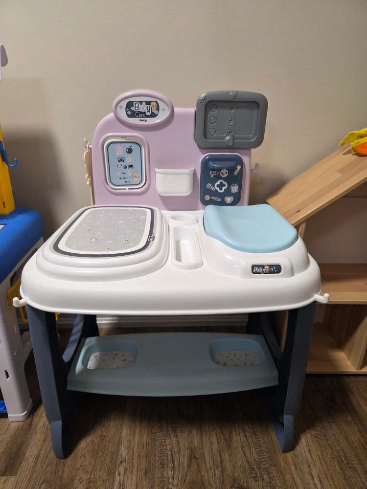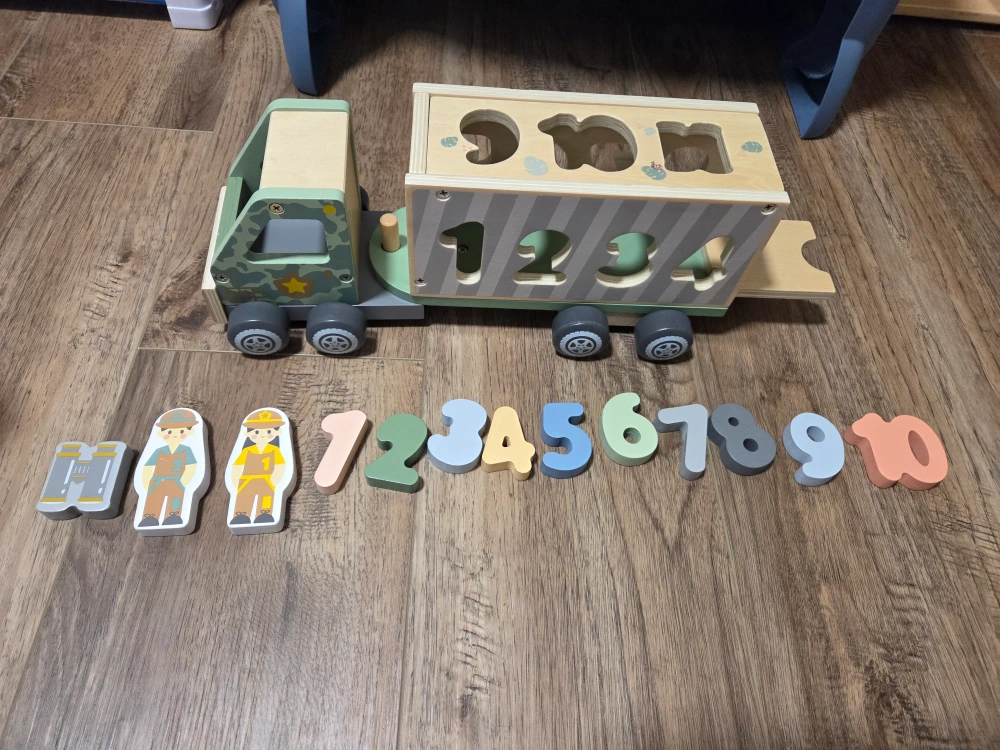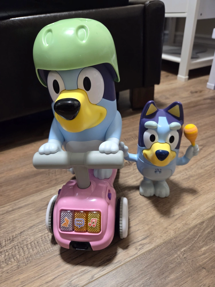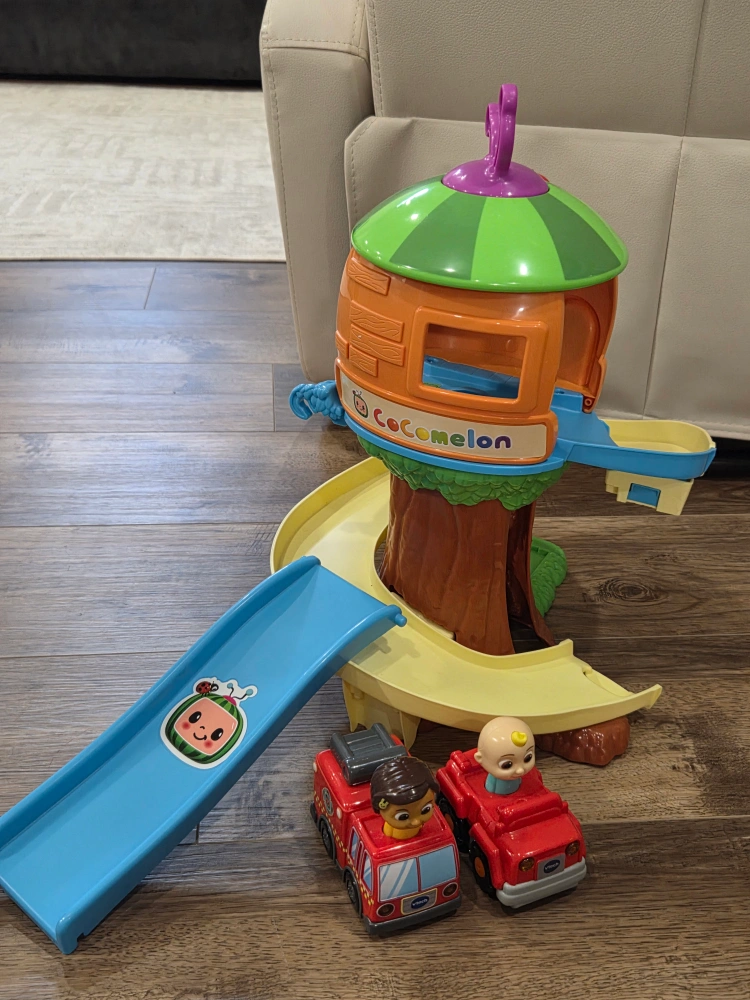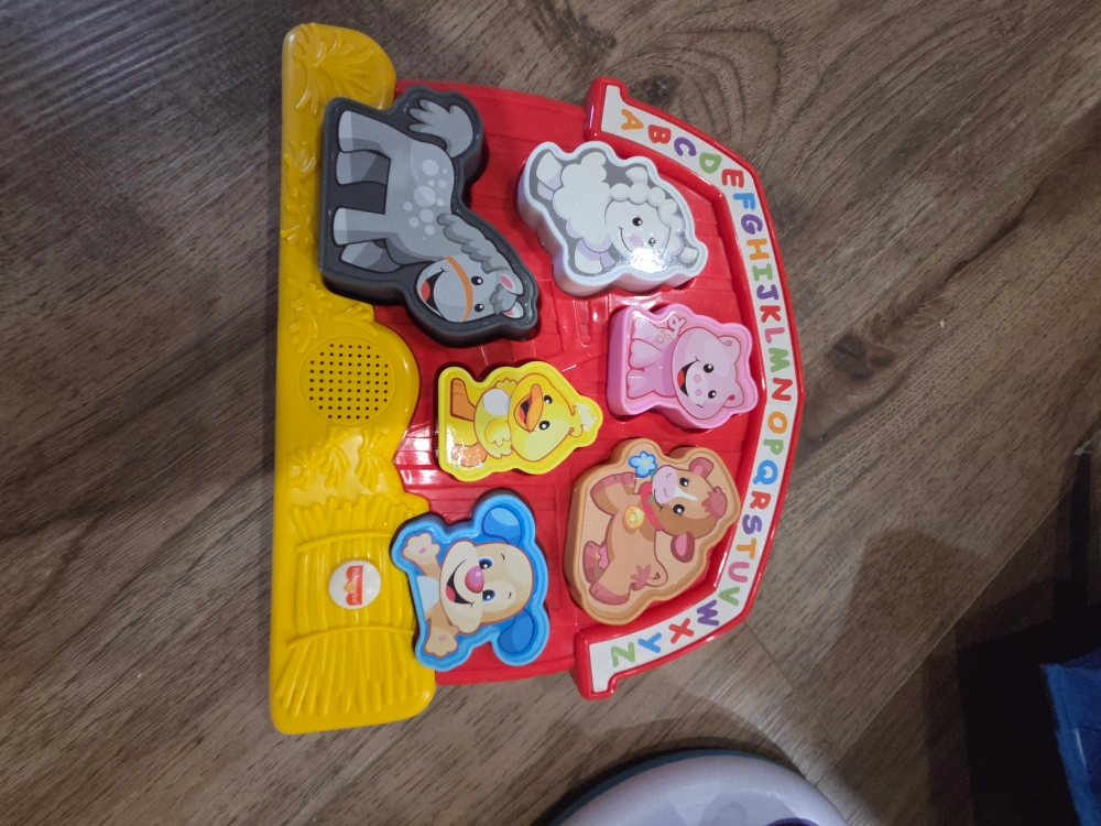 10A collection of gently used kids' toys ready for a new home! Included are a Cocomelon playset, a Baby Care playset, a wooden number and shape sorter truck, a Bluey scooter toy, and a Fisher-Price animal barn toy. Perfect for toddlers and young children.
