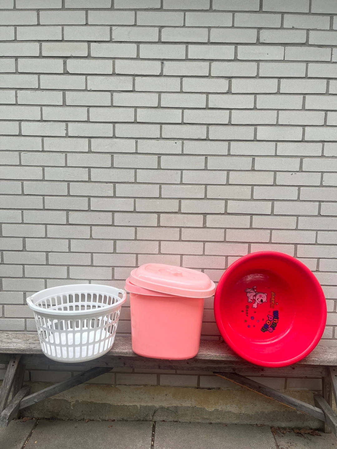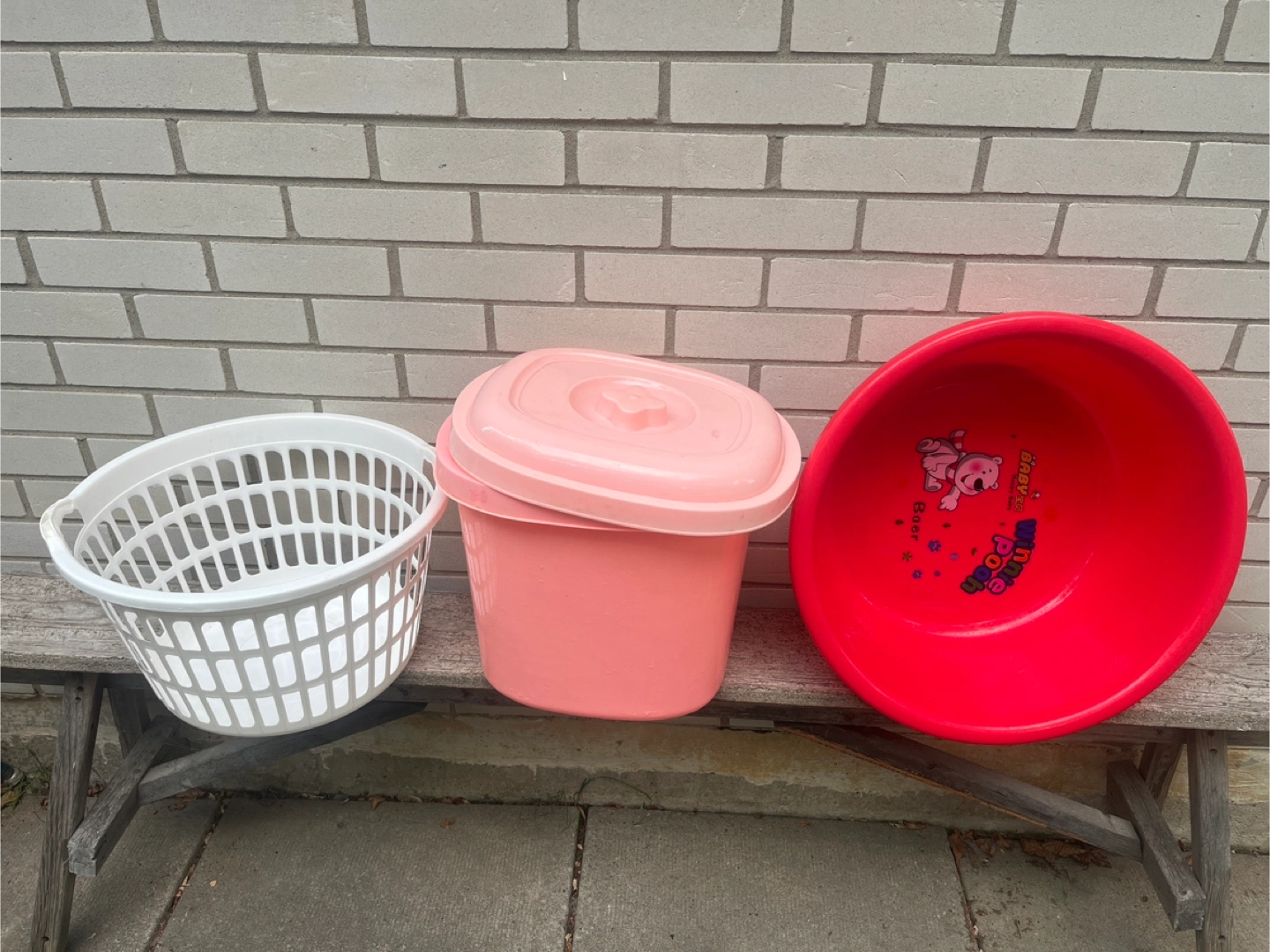 Selling a set of three assorted laundry baskets. Includes a white plastic basket, a pink bucket with lid, and a red plastic basin with a cute design. Great for organizing laundry or other household items! Price is negotiable.