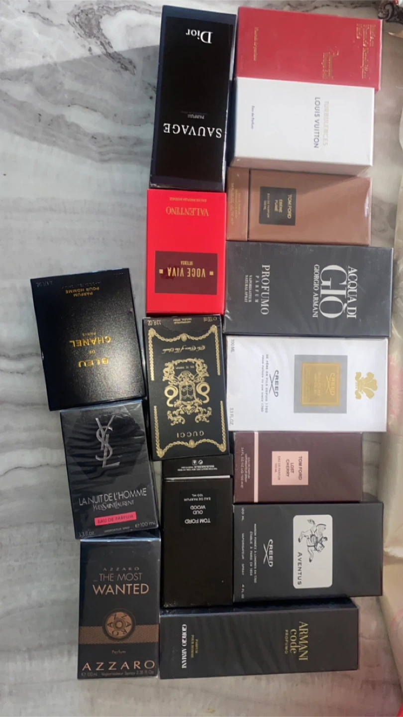 Selling a collection of various perfumes from top brands! You'll find popular scents like Dior Sauvage, Chanel Bleu, Gucci, Tom Ford Oud Wood, Giorgio Armani, Creed Aventus, and more! All are in their original packaging.