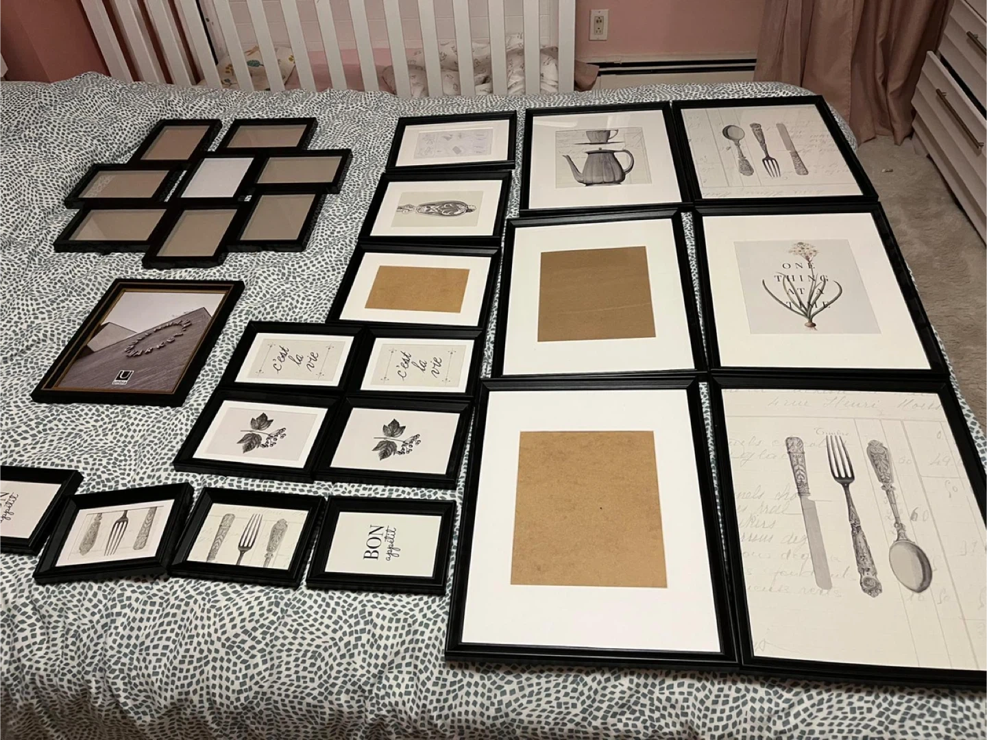 76Selling a collection of assorted picture frames, perfect for adding a touch of style to your home decor! Some frames include prints with phrases like "C'est la vie" and "Bon appétit", while others feature elegant silverware designs