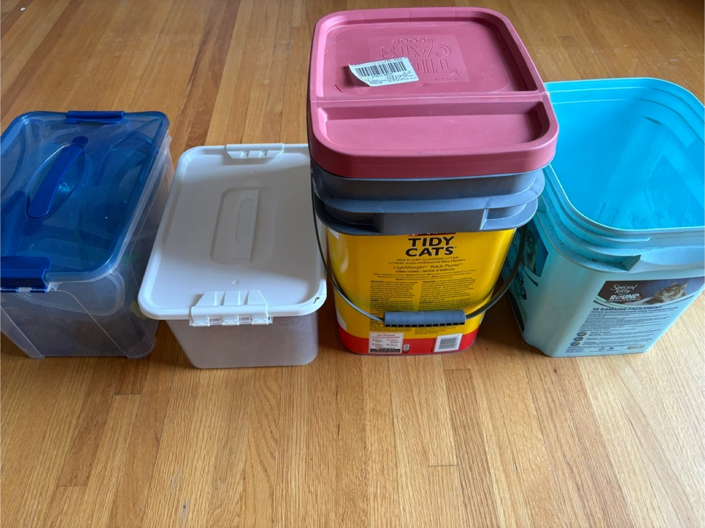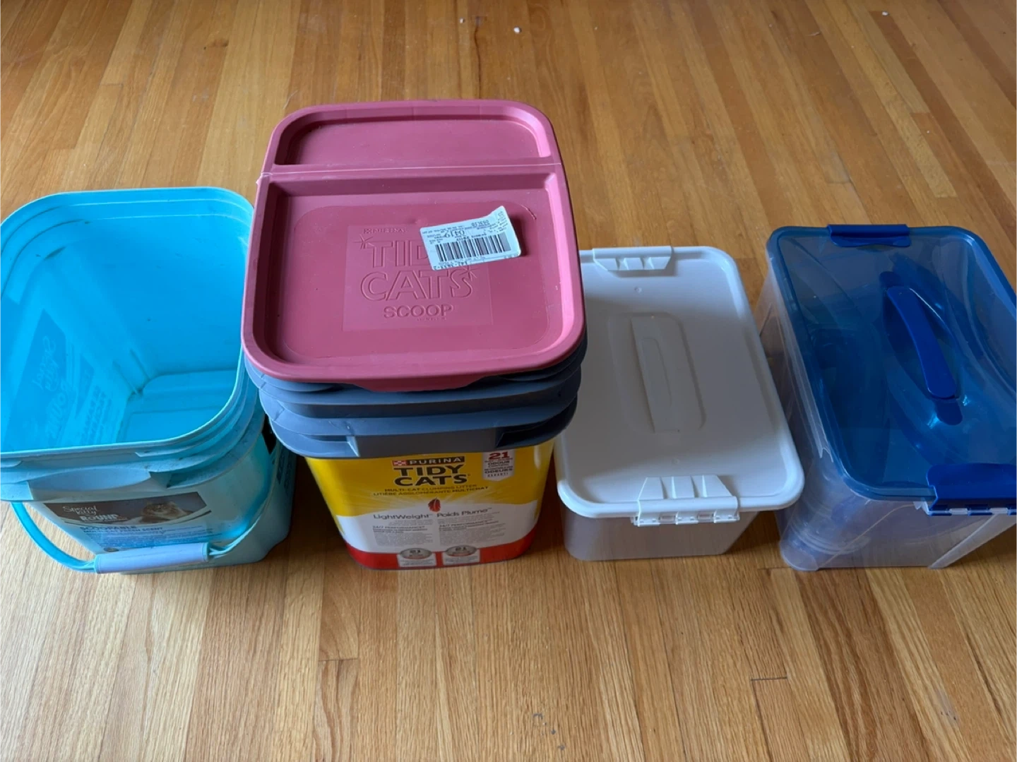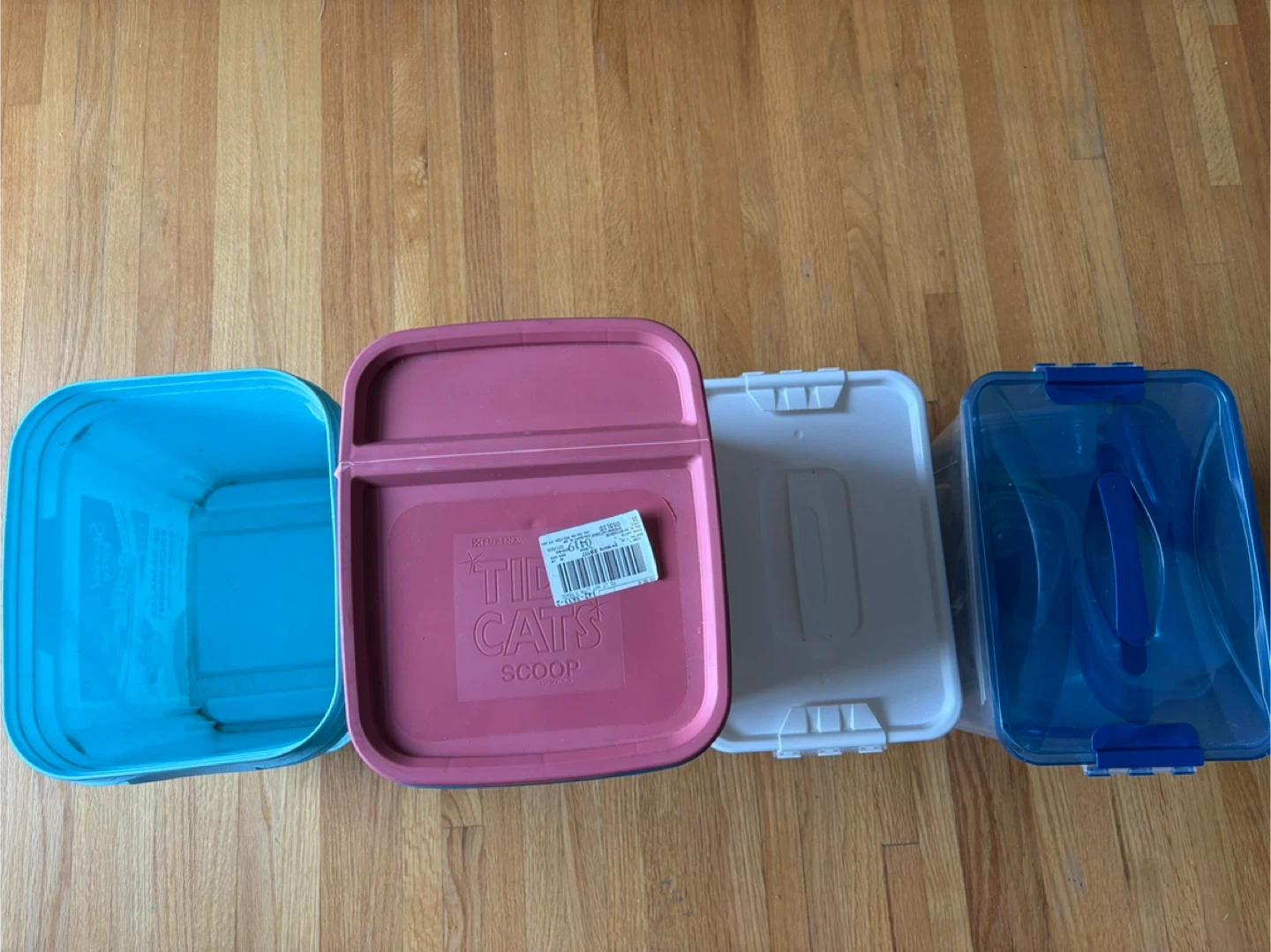 59Selling a set of four assorted plastic storage containers. There's a variety of sizes and colours, perfect for organizing your home or garage. They're all in good condition and ready for a new home!each one is 2-5$ , pick up at Morley trail NW