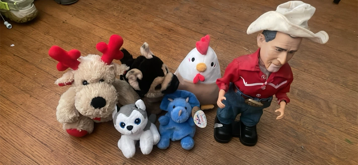 20Selling a collection of assorted plush toys! Included are a reindeer, cow, chicken, husky, rhino (with a Palm tag), and a cowboy doll. They're all in good condition and looking for a new home!