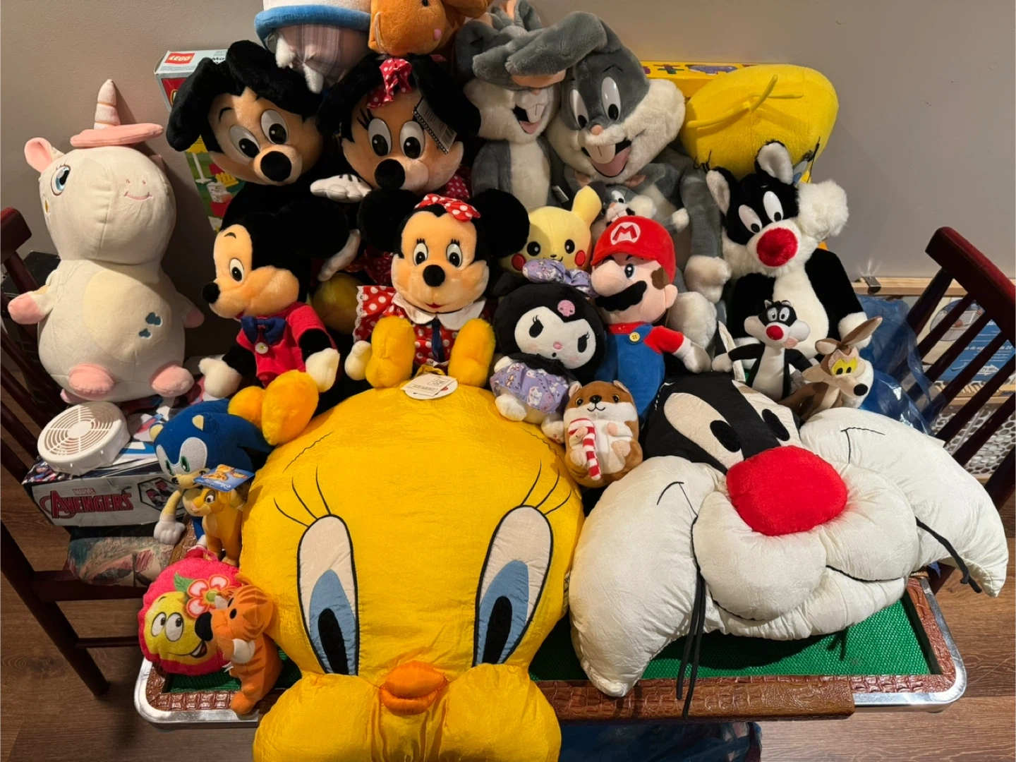 65Selling a collection of assorted plush toys! There's a variety of characters, including Mickey Mouse, Tweety Bird, Sylvester the Cat, and others. Great for collectors or kids who love stuffed animals!