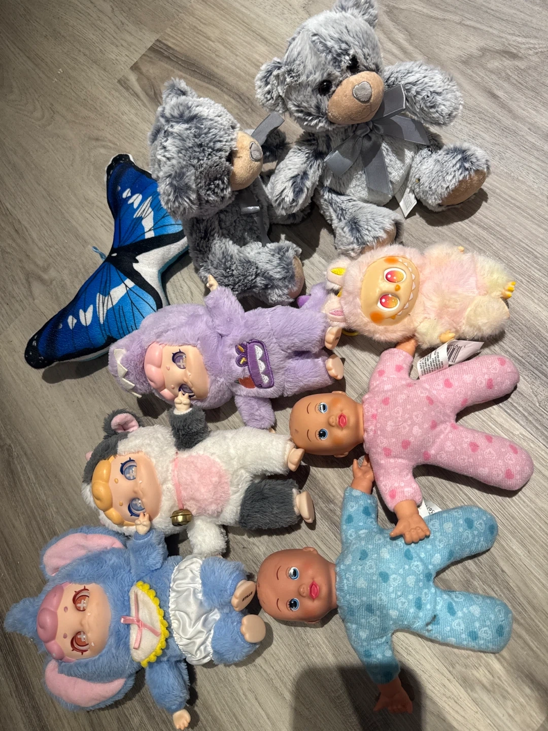 A collection of cute plush toys looking for a new home! Includes a couple of soft teddy bears in grey, a butterfly plush, and several baby doll plushies in various colours and designs. Perfect for kids or collectors! Price can be negotiated Bundle offer too!!!