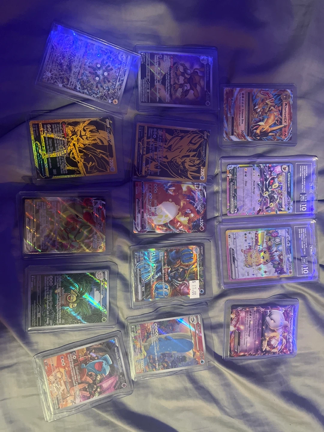65Selling a collection of Pokemon trading cards! You'll find a mix of characters and rarities. All cards are sleeved and in protective cases. Perfect for collectors or players looking to expand their collection! If there are cards you want to know about dm me and let’s negotiate a price!