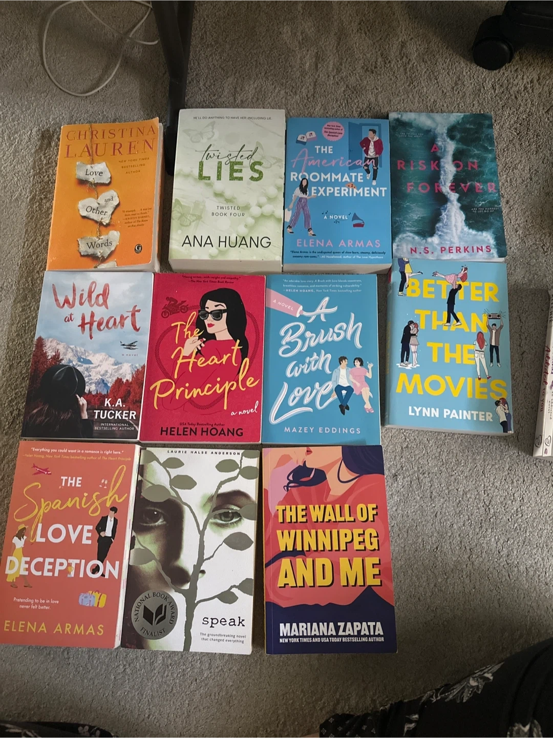 60Selling a collection of romance novels in great condition! Titles include: - Love and Other Words by Christina Lauren - Twisted Lies by Ana Huang - The American Roommate Experiment by Elena Armas - A Risk on Forever by N.S. Perkins - Wild at Heart by K.A. Tucker - The Heart Principle by Helen Hoang - A Brush with Love by Mazey Eddings - Better Than The Movies by Lynn Painter - The Spanish Love Deception by Elena Armas - Speak by Laurie Halse Anderson - The Wall of Winnipeg and Me by Mariana Zapata Some of these books have annotated tabs and can be removed Each book is 6 dollars
