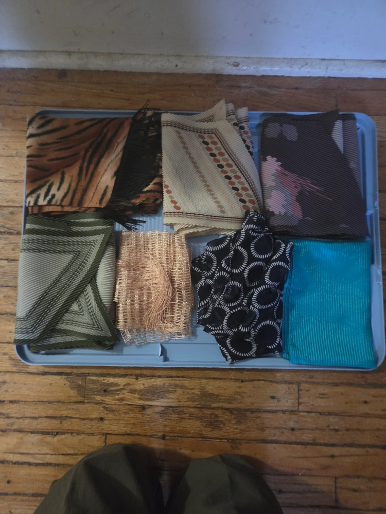 Selling a collection of assorted scarves with different patterns and textures! There's a variety of colours and designs to choose from, perfect for adding a unique touch to your outfits. They are in great condition and ready for a new home!