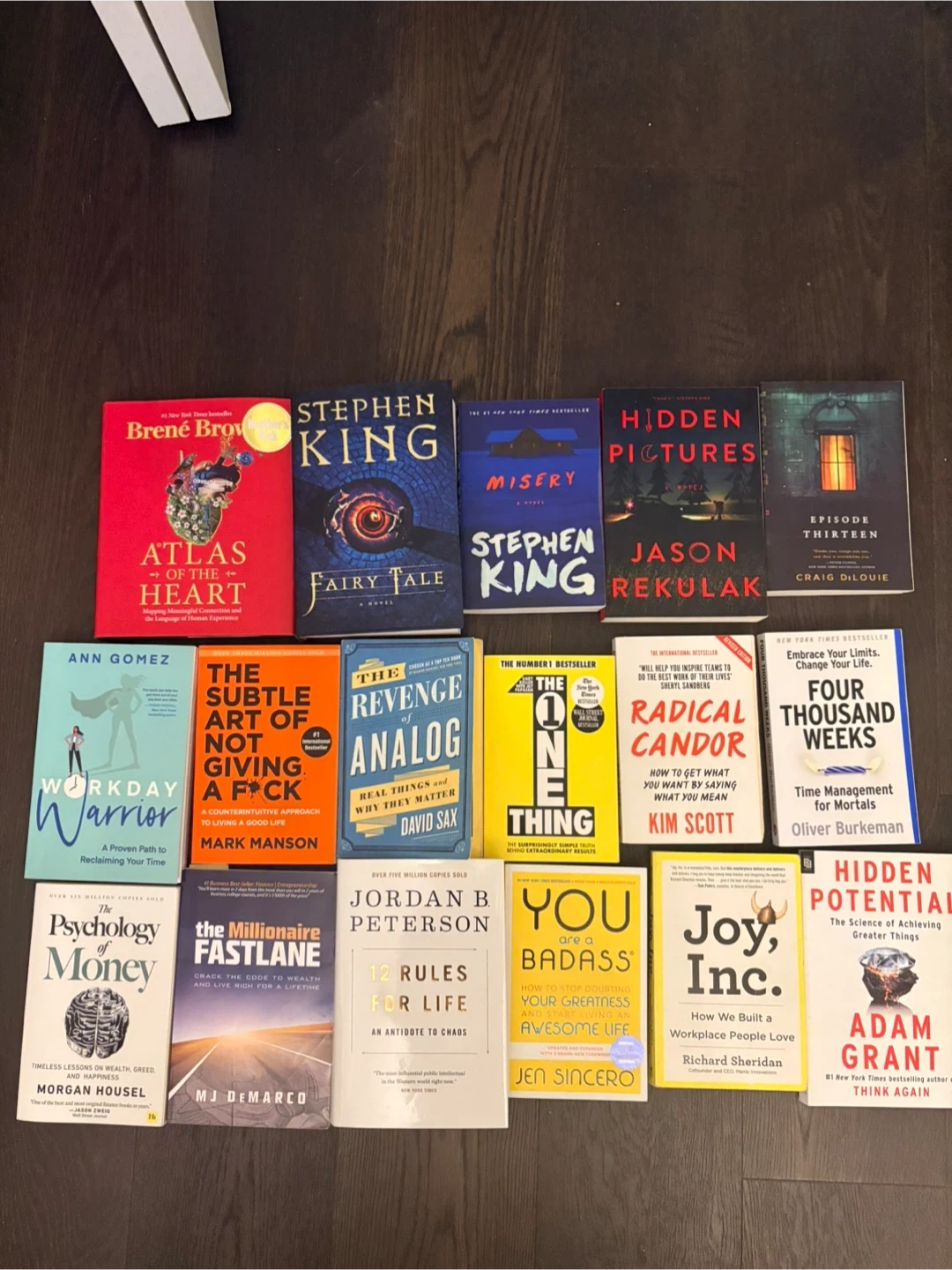 A collection of various self-help and fiction books, including titles from authors like Stephen King, Brené Brown, and Adam Grant! Perfect for expanding your library with some interesting reads Hard Cover - $20 each Soft Cover - $10 each *Big discount if you buy them all
