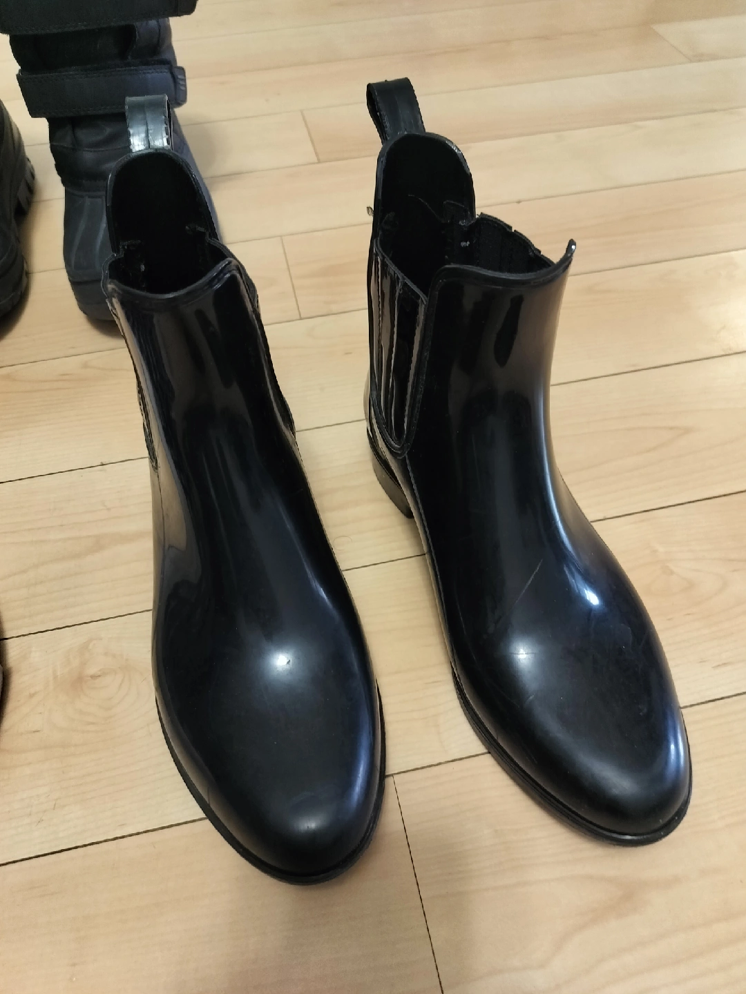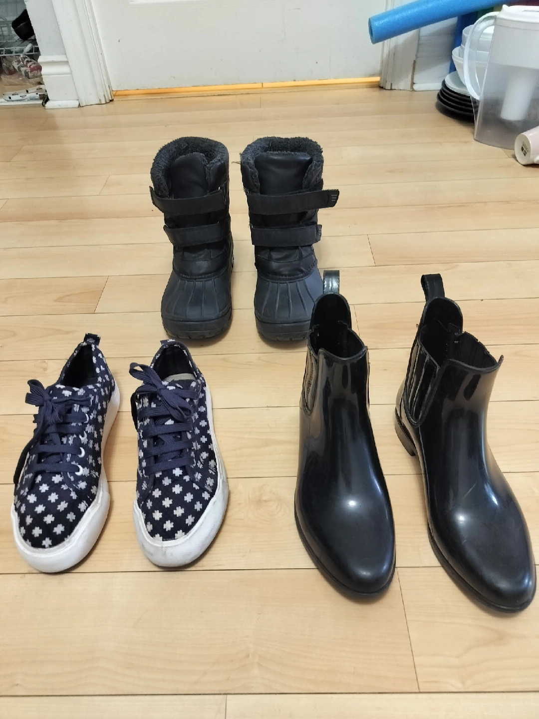 Move out sale. Selling a variety of shoes and boots! A pair of black and white patterned sneakers - good condition - $5. A pair of black rain boots - good condition - $5. A pair of winter boots with velcro straps - good condition but a minor cut which can be glued and then it can work nicely. - FREE with other two. All three for $10. Pick up at 23 Cox Boulevard Markham.