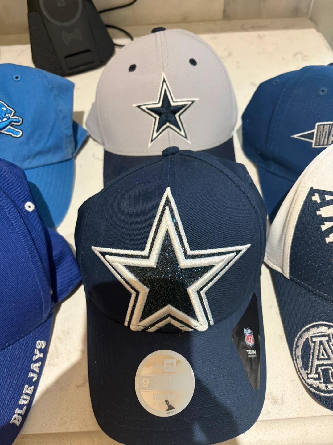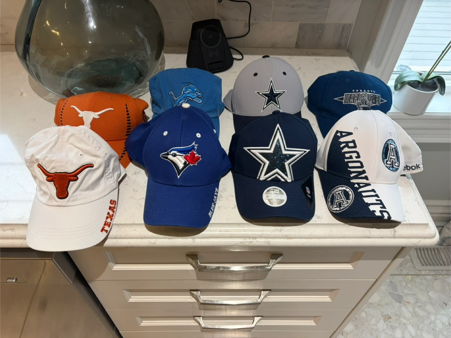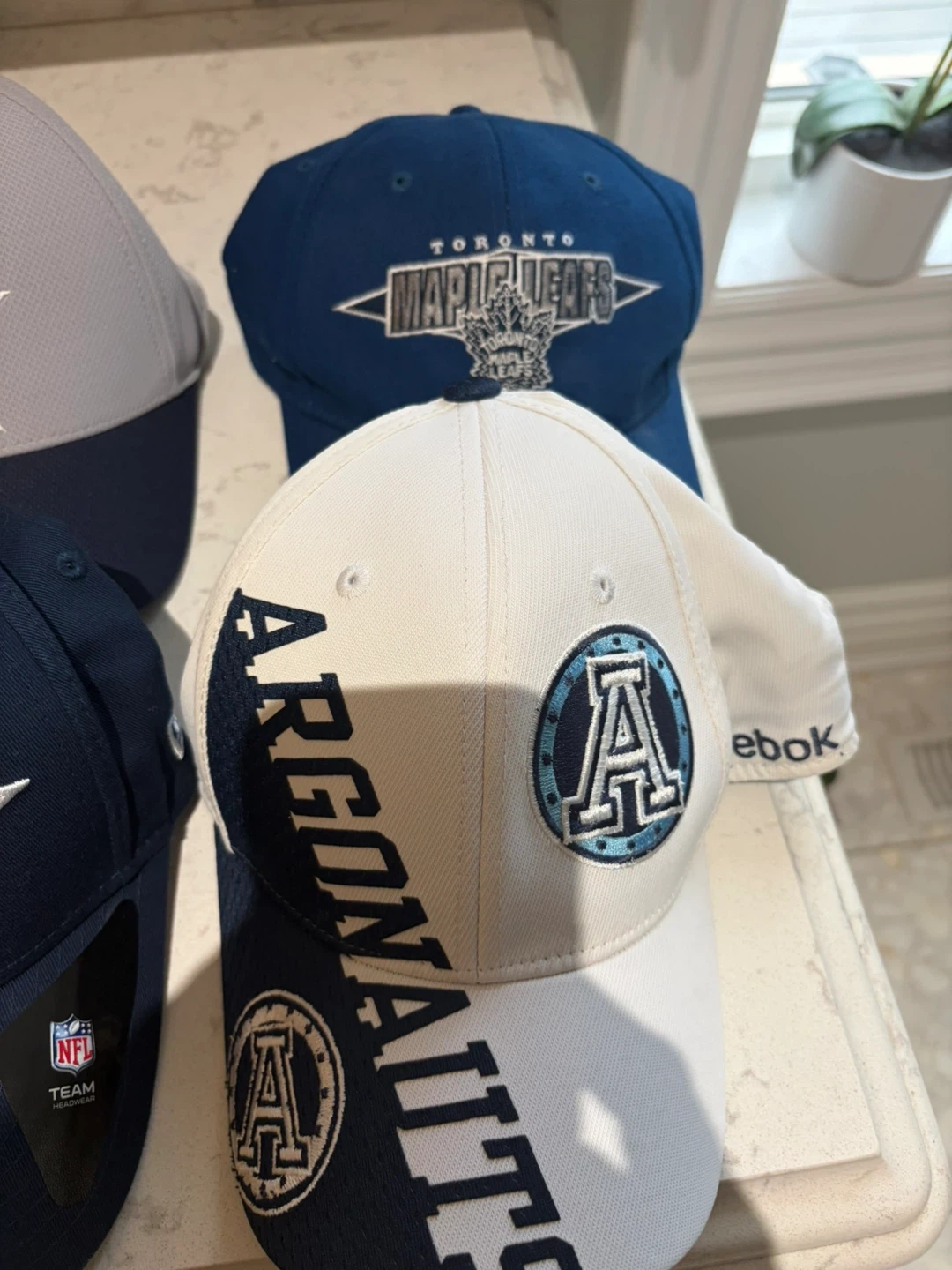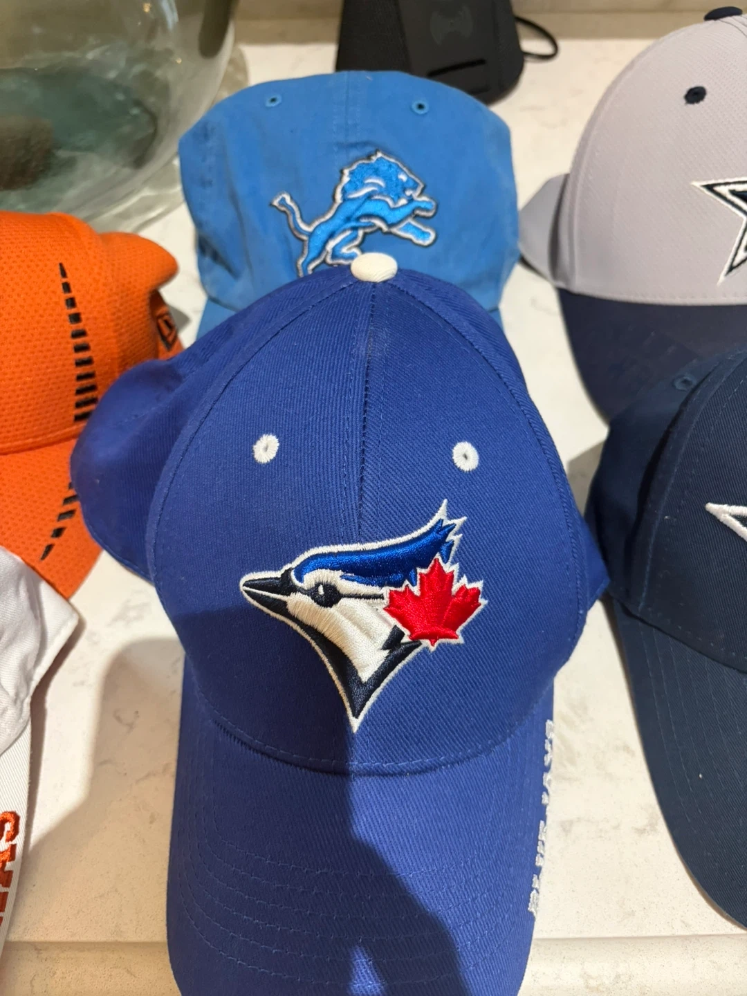 75Selling a collection of baseball caps featuring various sports teams! Included are caps for the Toronto Blue Jays, Toronto Maple Leafs, Detroit Lions, Dallas Cowboys, Texas Longhorns, and the Toronto Argonauts. All caps are in great condition and ready for a new home!