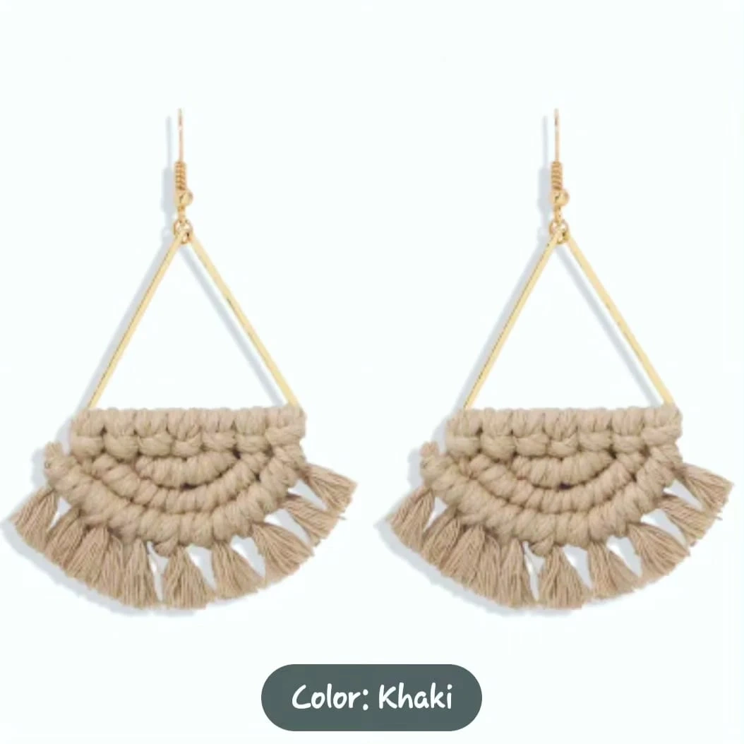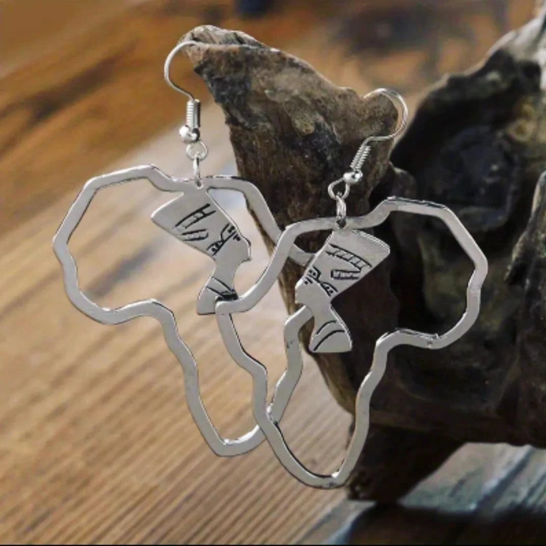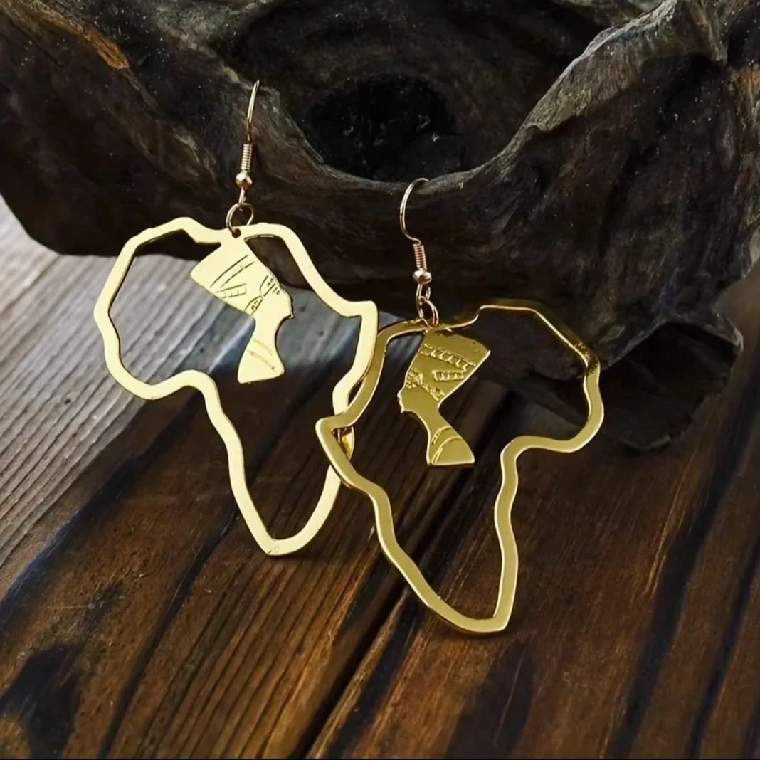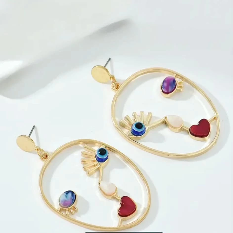 101Five pairs of unique earrings. Styles include macrame, Africa-shaped, and abstract face designs. Materials vary. Gold and silver tones. Lightweight and stylish.