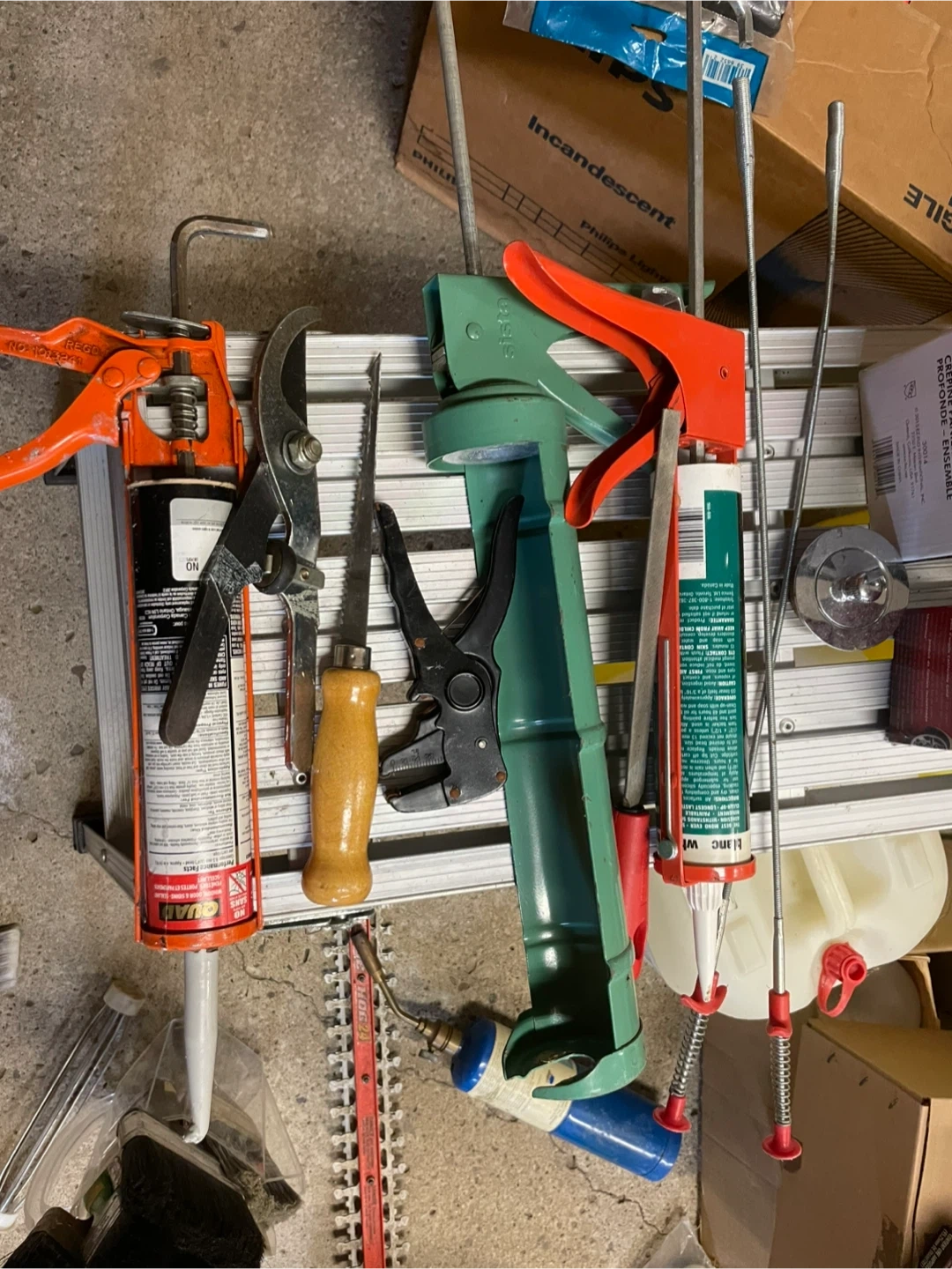 Selling a collection of assorted tools. Includes caulking guns, pruning shears, a saw, and other handy items. Great for DIY projects and home repairs