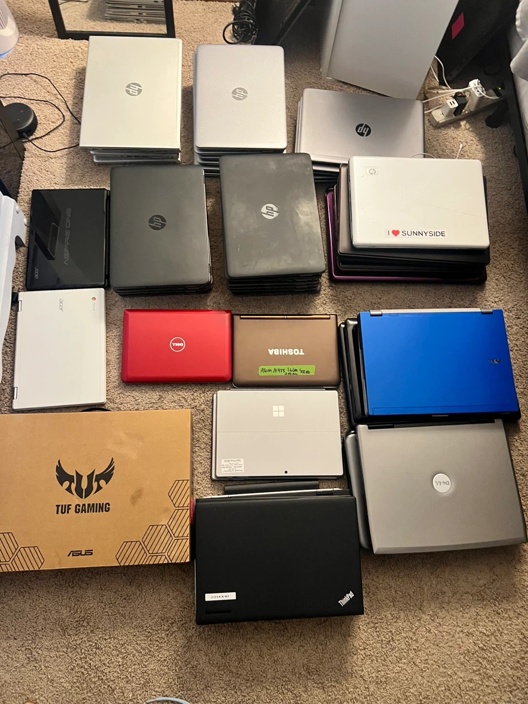 112Selling a variety of used laptops including Acer, ASUS (TUF Gaming box visible), Dell, Lenovo ThinkPad, and Toshiba models. See the photos for conditions and details