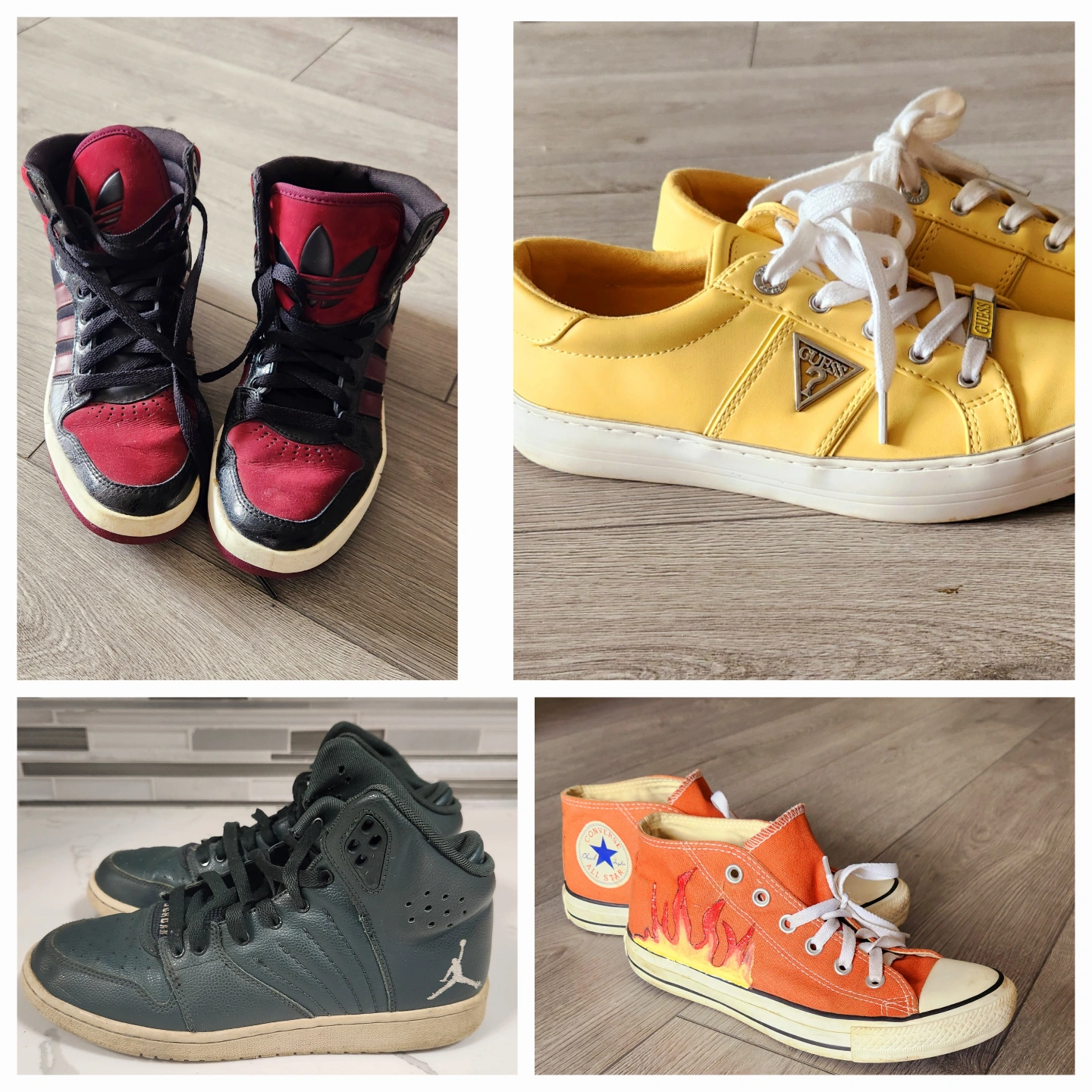 Selling a collection of used sneakers. Includes Adidas high tops in red and black, Guess yellow sneakers, Air Jordan high tops in green, and Converse high tops with a flame design. All in used condition. Men's, Women's and kid's