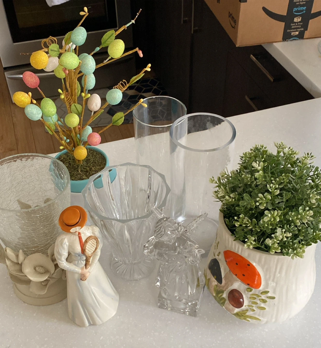 123Selling a collection of assorted vases and figurines! There are a few clear glass vases, a decorative figurine of a woman with a tennis racket, and a cute little artificial plant in a mushroom-themed pot. Perfect for adding a touch of charm to any room! $2 each or 12 all