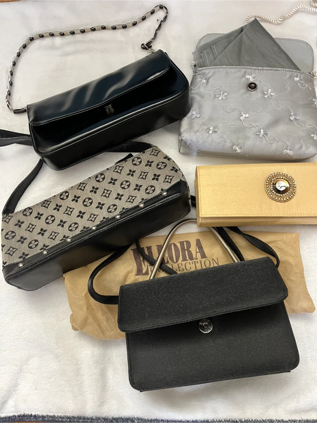 Selling a collection of assorted women's clutch bags. There are five bags in total, each with its own unique style and design. Perfect for evenings out or special occasions!