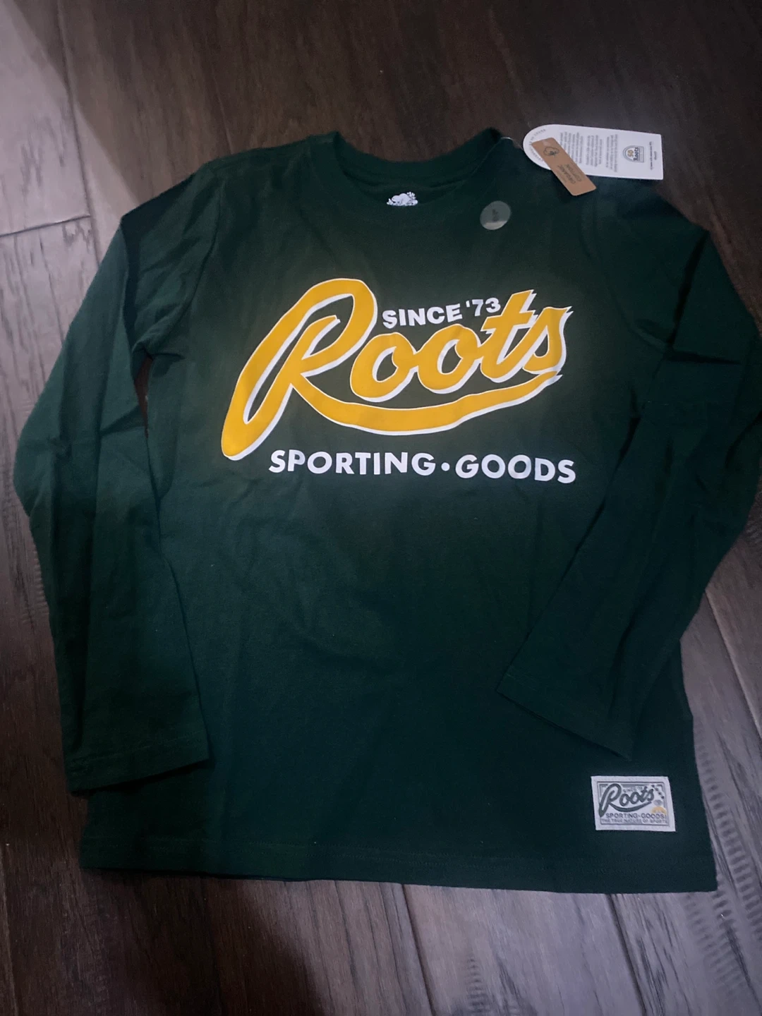 This is a Roots long sleeve t-shirt. It's green and features the 'Roots Since '73 Sporting Goods' graphic. Made of cotton.this is for boys kids size LG