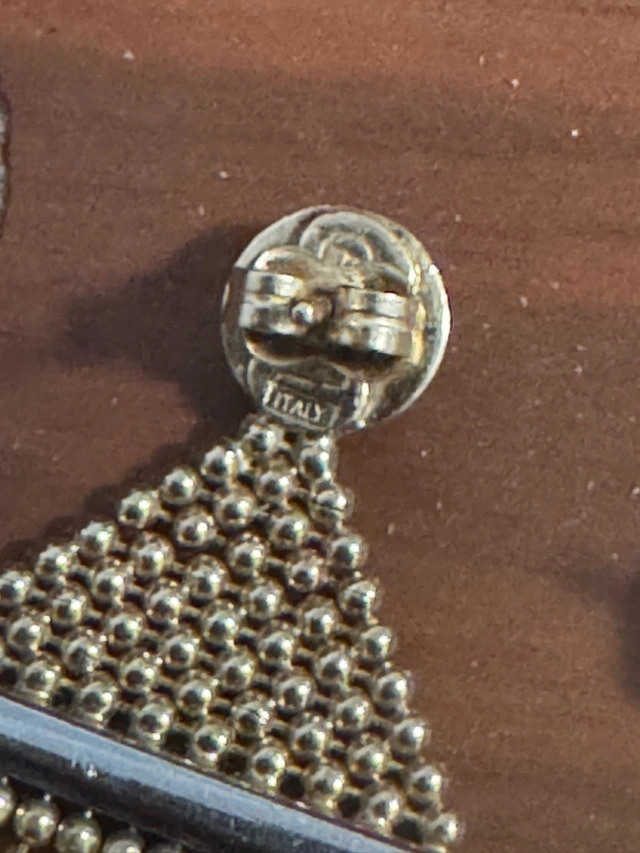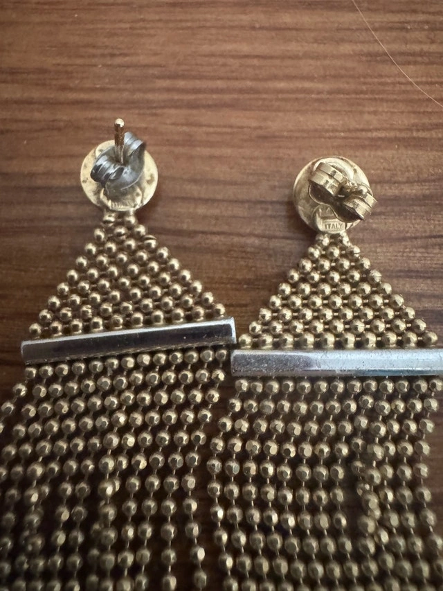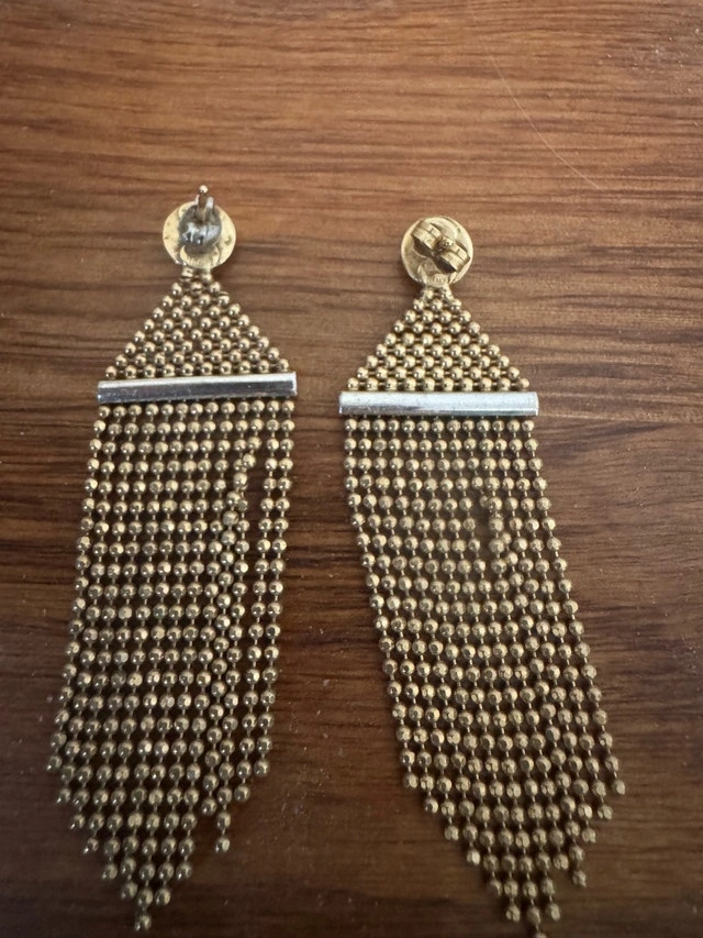 A pair of used 14k gold earrings crafted in Italy, featuring a unique beaded tassel design. These earrings add a touch of elegance and distinctive flair to any ensemble. Metal: 14k Gold. Origin: Italy. Style: Beaded Tassel. Asking $750. Condition: Used - Good. Payment accepted: Cashless payment, Cash.