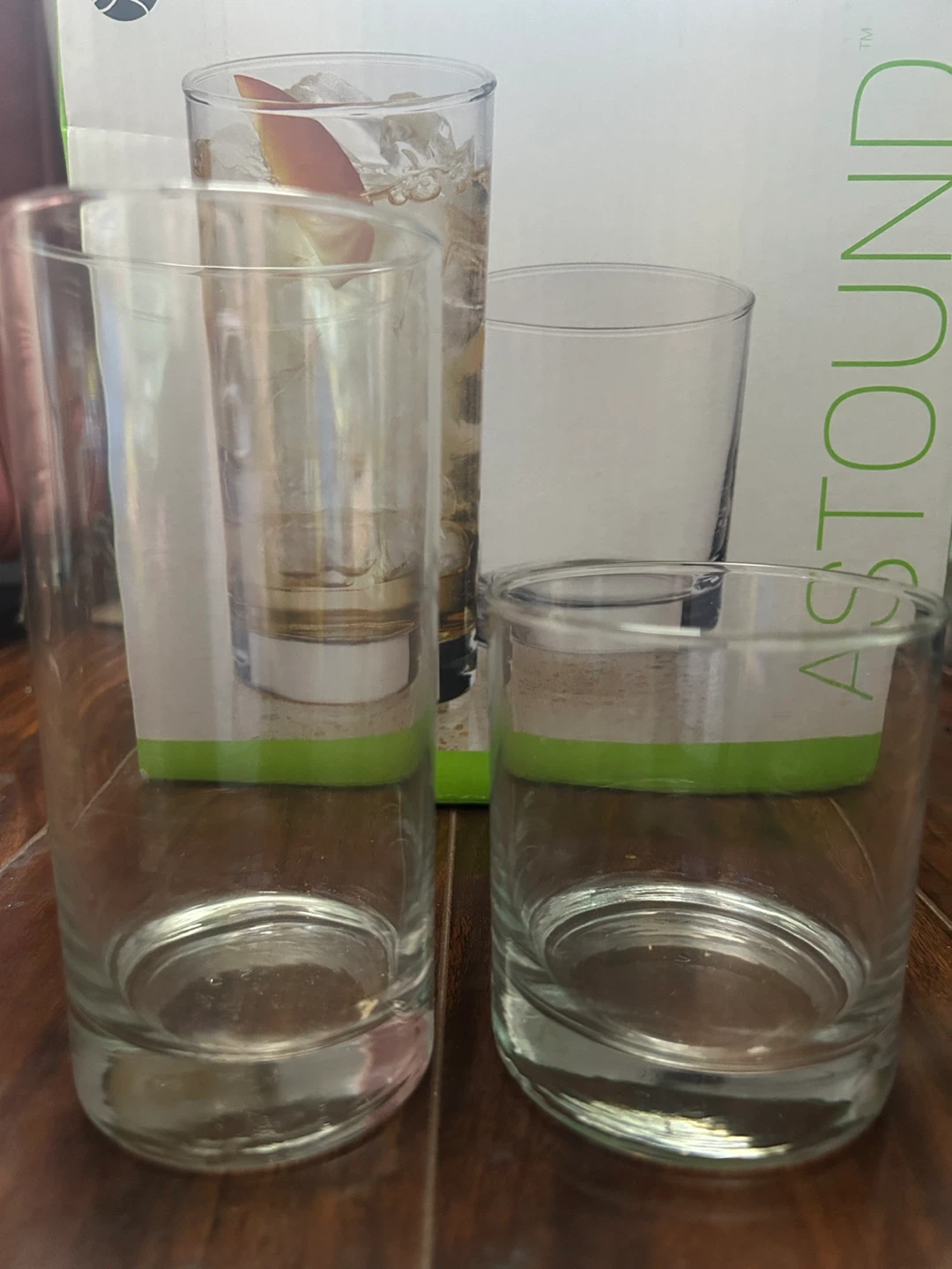 85Selling a set of clear drinking glasses by Astound: 6 small glasses and 4 large ones (intact).