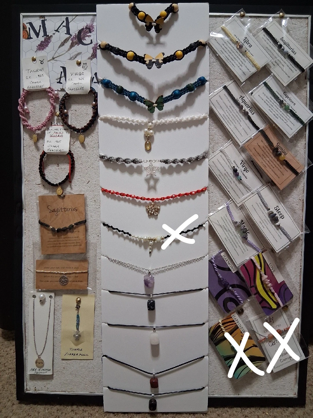 53Handmade macrame Bracelets and Pendants. *Taurus (s.s. .925 charm), $12. *Virgo (s.s. .925 charm), $12. *Mars (s.s. .925 charm),$12. *All other astro & healing stone bracelets, $8 - $10. *Pendants, $12 - $20. Please msg for price of your chosen style.