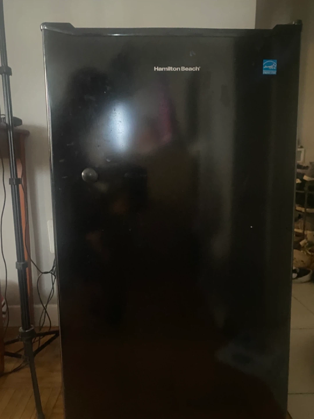 Hamilton Beach compact refrigerator in black. It's a great size for a dorm room or small office. The unit is in good working order.