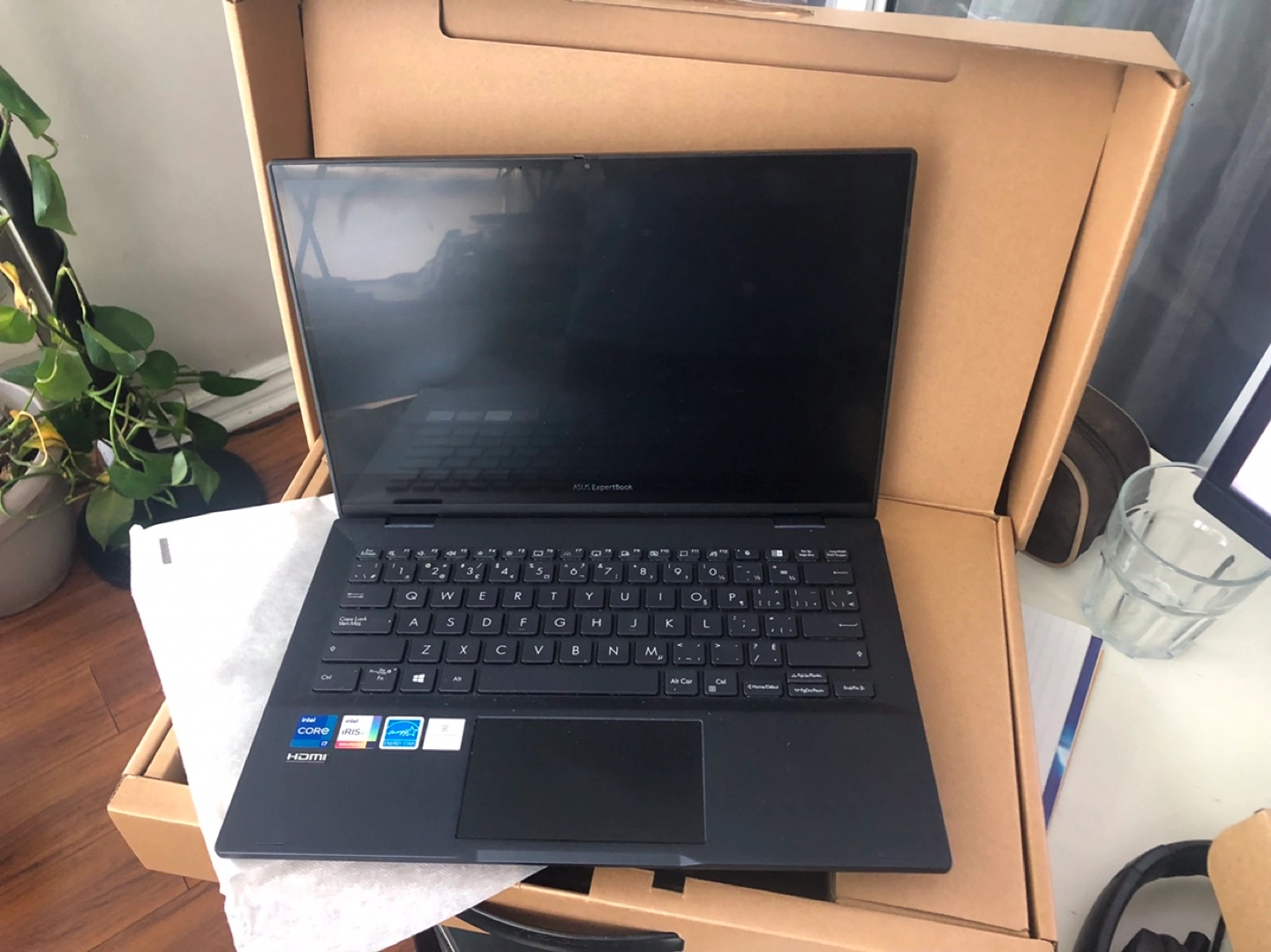 Asus expert book B5302FEA 13.3” OLED touchscreen laptop intel core i7 with free carry bag in black. Dark-colored laptop. Includes a keyboard and display. It can be rotated, allowing the screen to fold all the way around. A great tool for browsing in bed, or in a relaxing position.