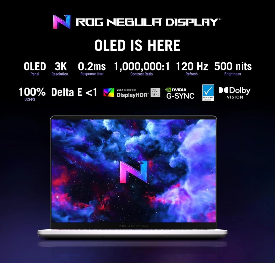 Looking to sell a slim gaming laptop: ASUS ROG Zephyrus 14". It features a stunning ROG Nebula Display with OLED technology. Enjoy vibrant visuals with its 3K resolution, rapid 0.2ms response time. The display also boasts a 120 Hz refresh rate.