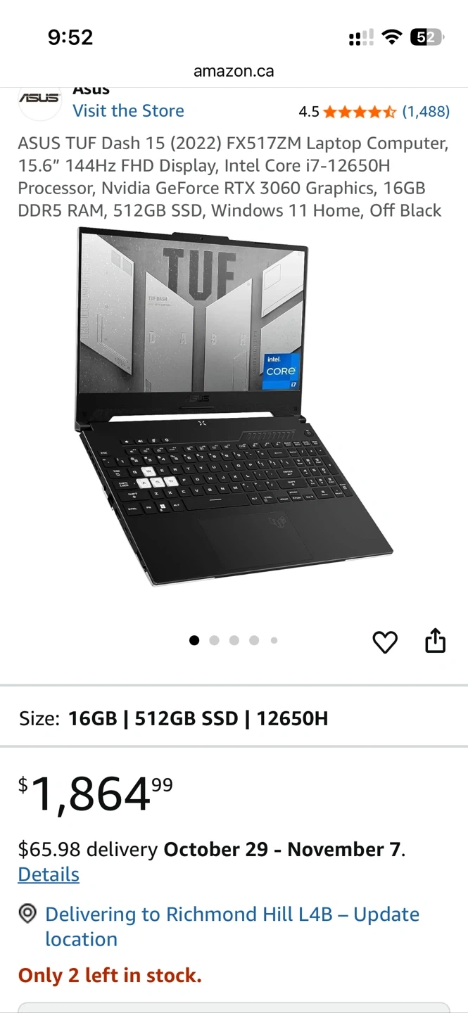 60๐ป ASUS TUF Dash 15 (2022) FX517ZM i7 / RTX 3060 / 16GB RAM / 512GB SSD / Windows 11 Enterprise Powerful and slim gaming laptop in excellent working condition. Runs fast and smooth โ perfect for gaming, editing, or everyday use. Only a small mark on the back corner (shown in photos) โ purely cosmetic, no performance issues. ๐น 15.6โ FHD 144 Hz display ๐น Intel Core i7-12650H (12-core CPU) ๐น NVIDIA RTX 3060 6 GB graphics ๐น 16 GB DDR5 RAM ๐น 512 GB SSD ๐น Windows 11 Enterprise (activated) โ Works perfectly โ Battery holds charge well โ Screen and keyboard are clean โ Factory reset โ ready for a new owner ๐ฐ Price: $1,250 CAD ๐ Location: Richmond Hill ๐ฉ Message me if interested โ serious buyers only please.
