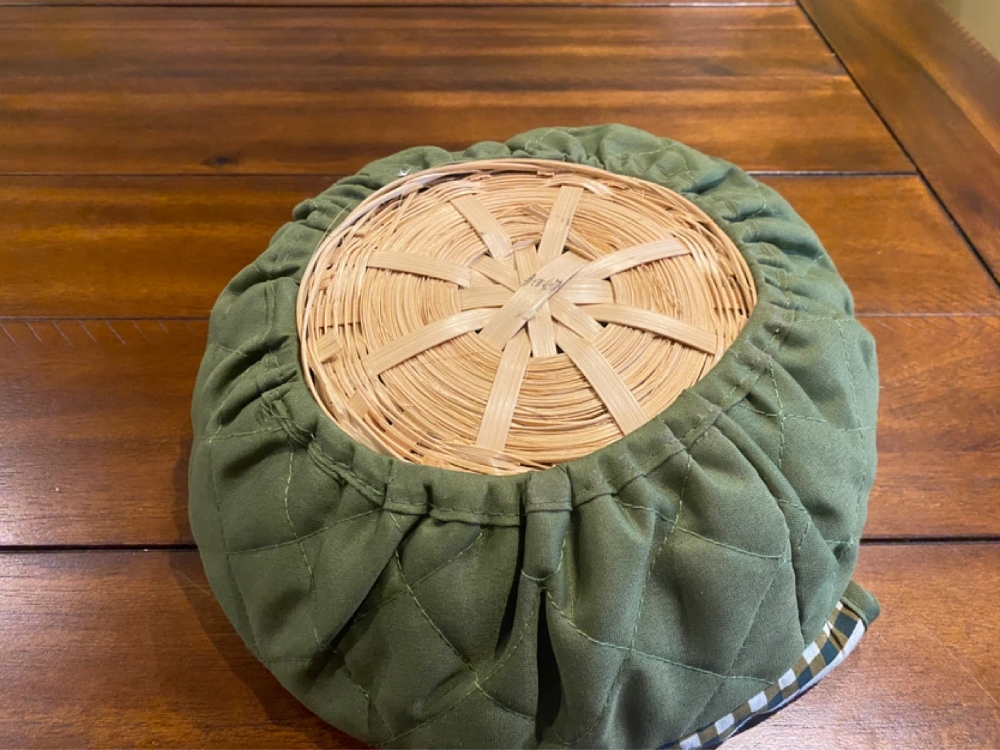 Ashuley Bread basket-A quilted bowl cozy featuring a kitchen theme with wine bottles and vegetables. It's made with a green outer fabric and a patterned inner fabric. The bottom is a woven straw material.