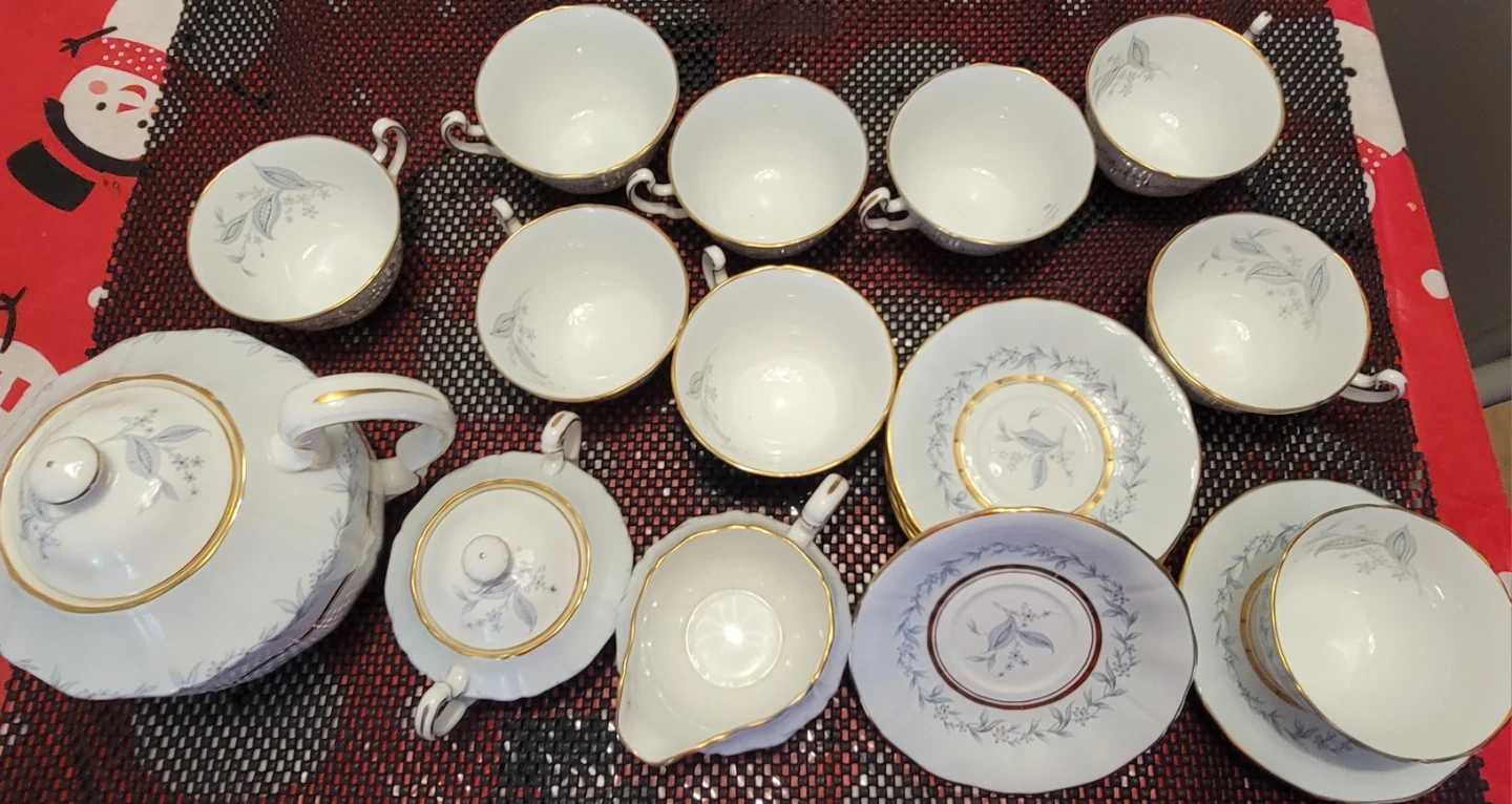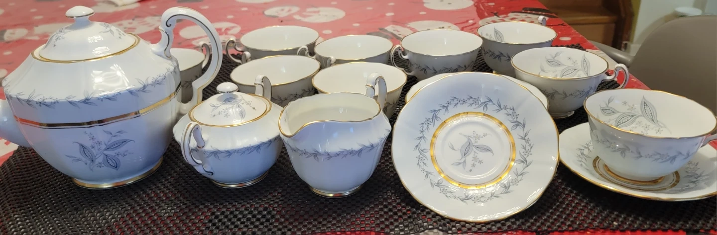 This vintage tea set includes a teapot, 9 cups with 7 saucers, a creamer pitcher, and a sugar bowl. The set features a delicate blue floral pattern with gold trim. It's perfect for serving guests or for a special occasion.