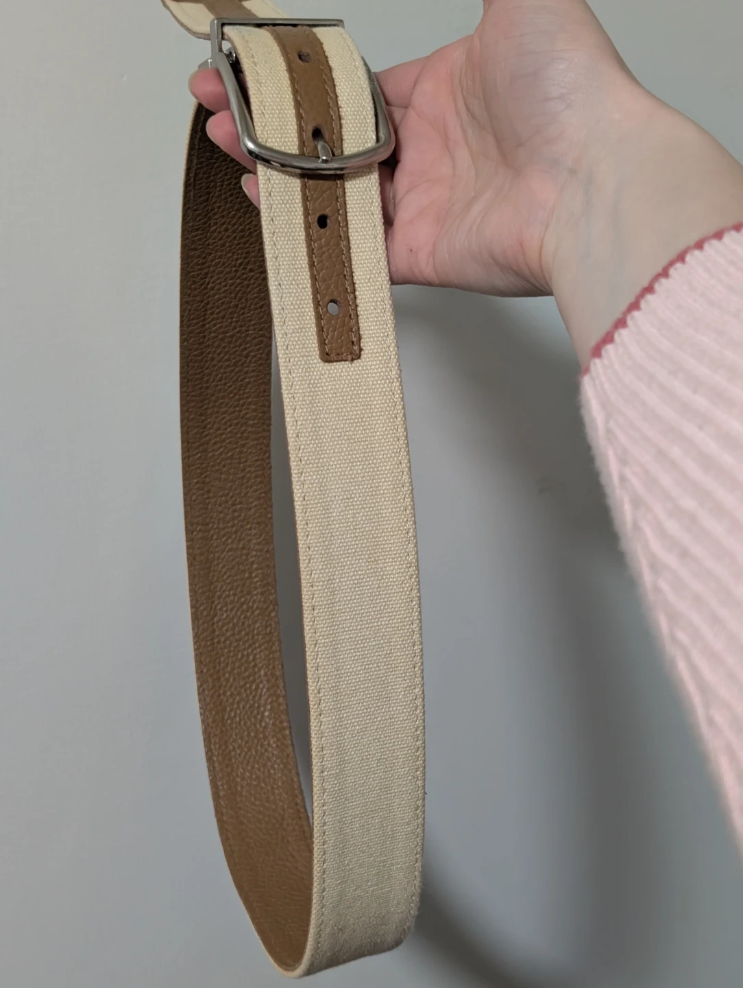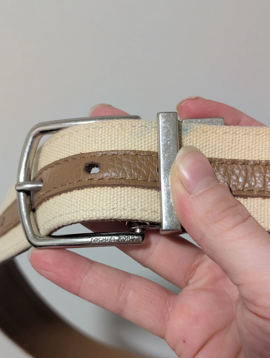 This Michael Kors belt is reversible, featuring a tan pebbled leather side and a cream canvas side with tan leather accents. It has a silver-tone buckle.