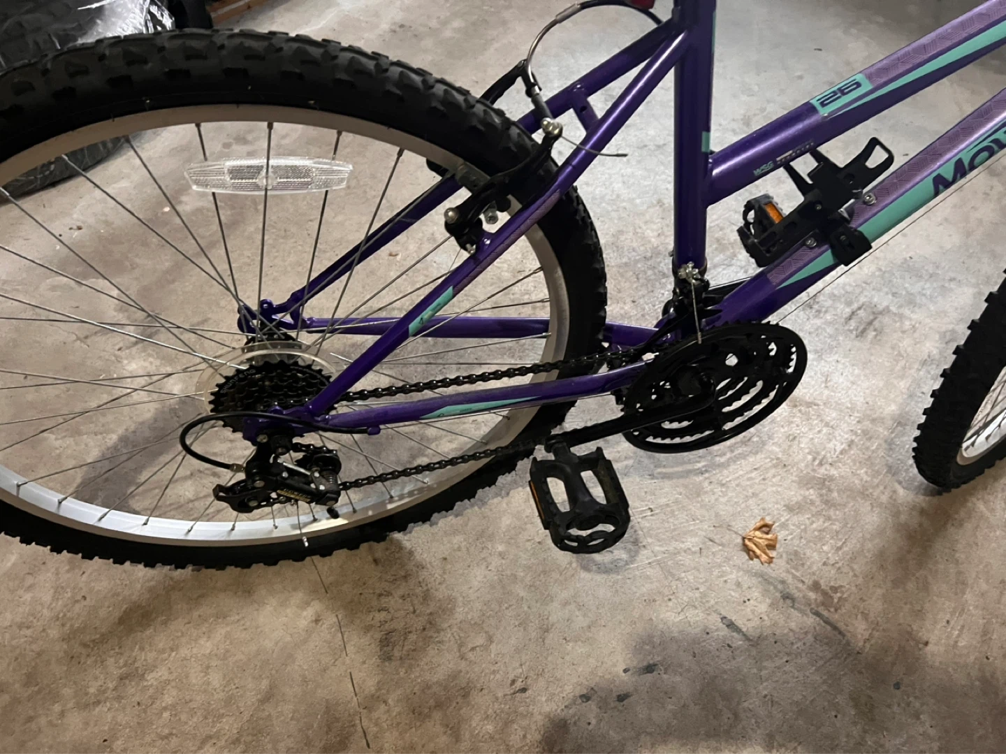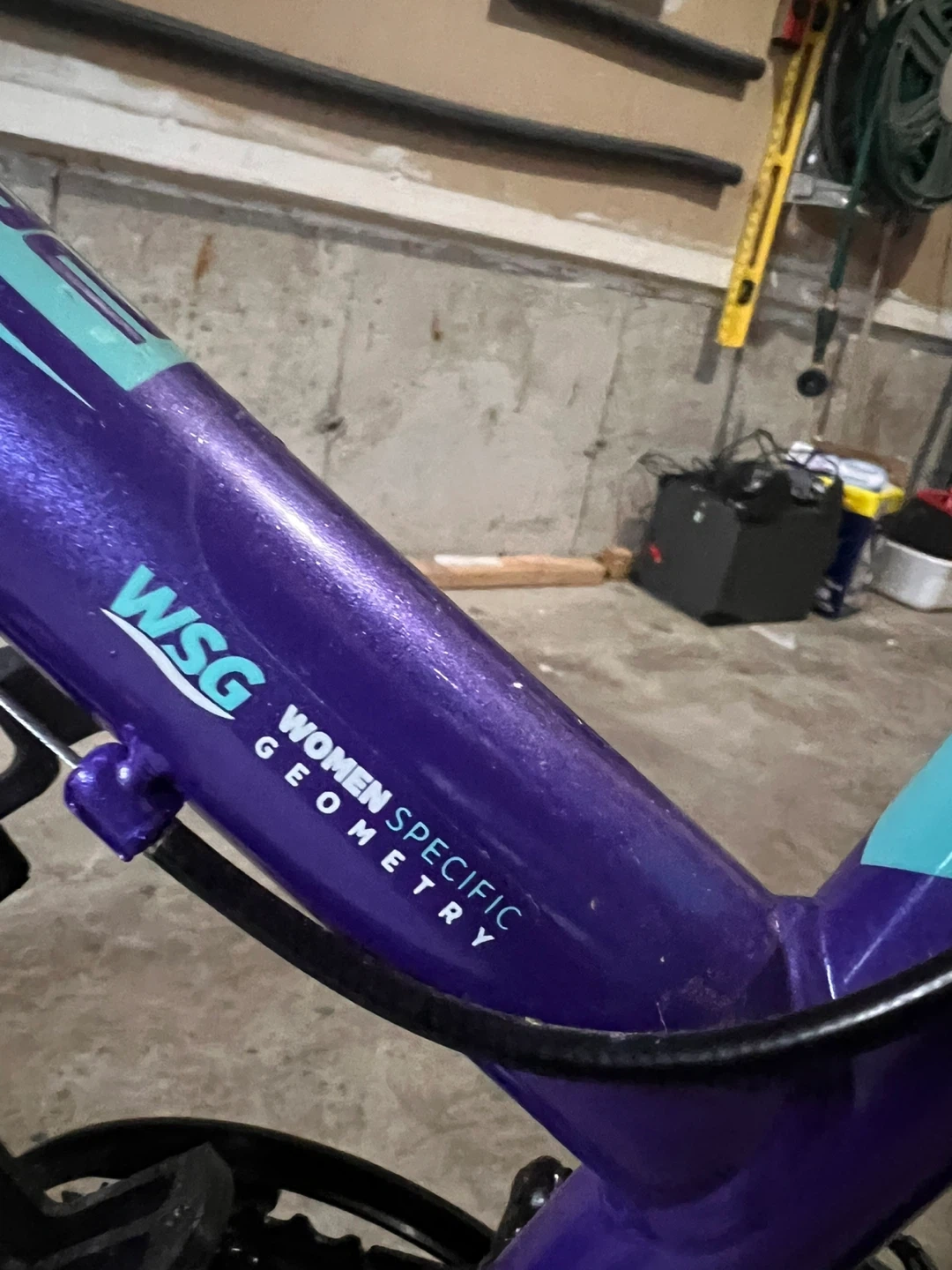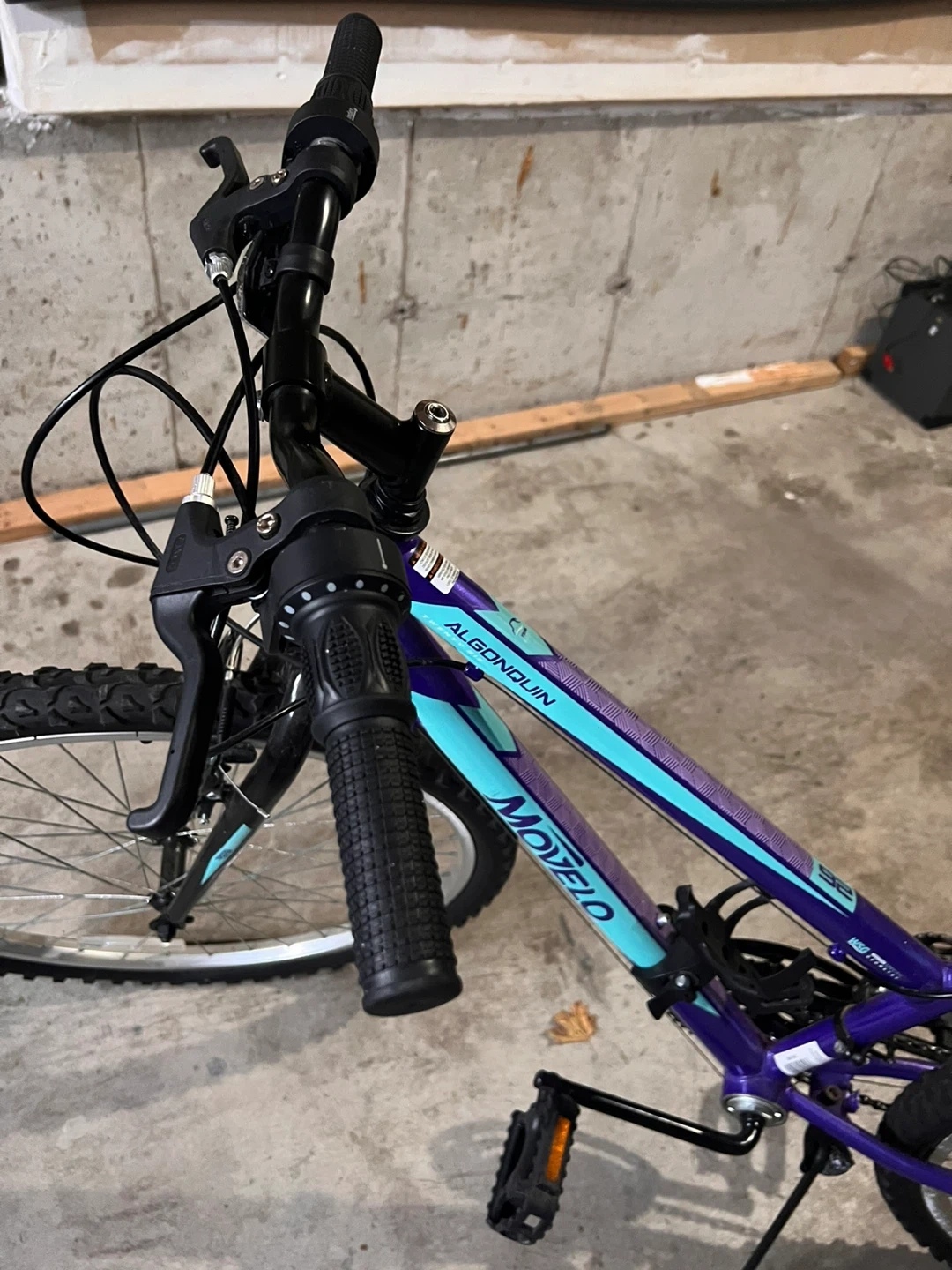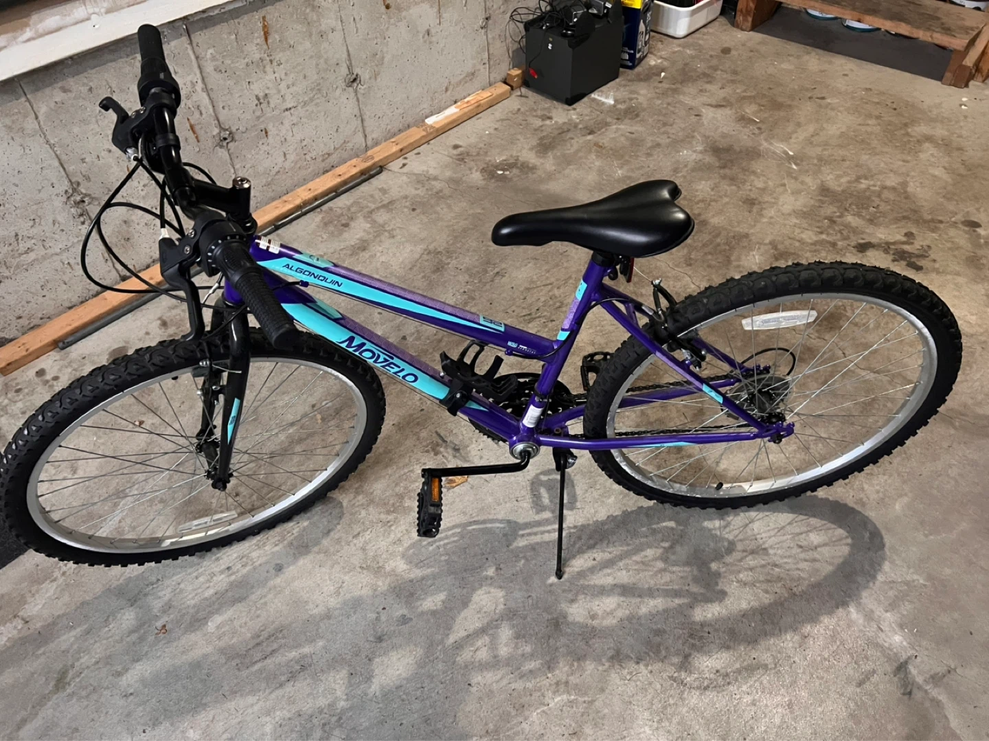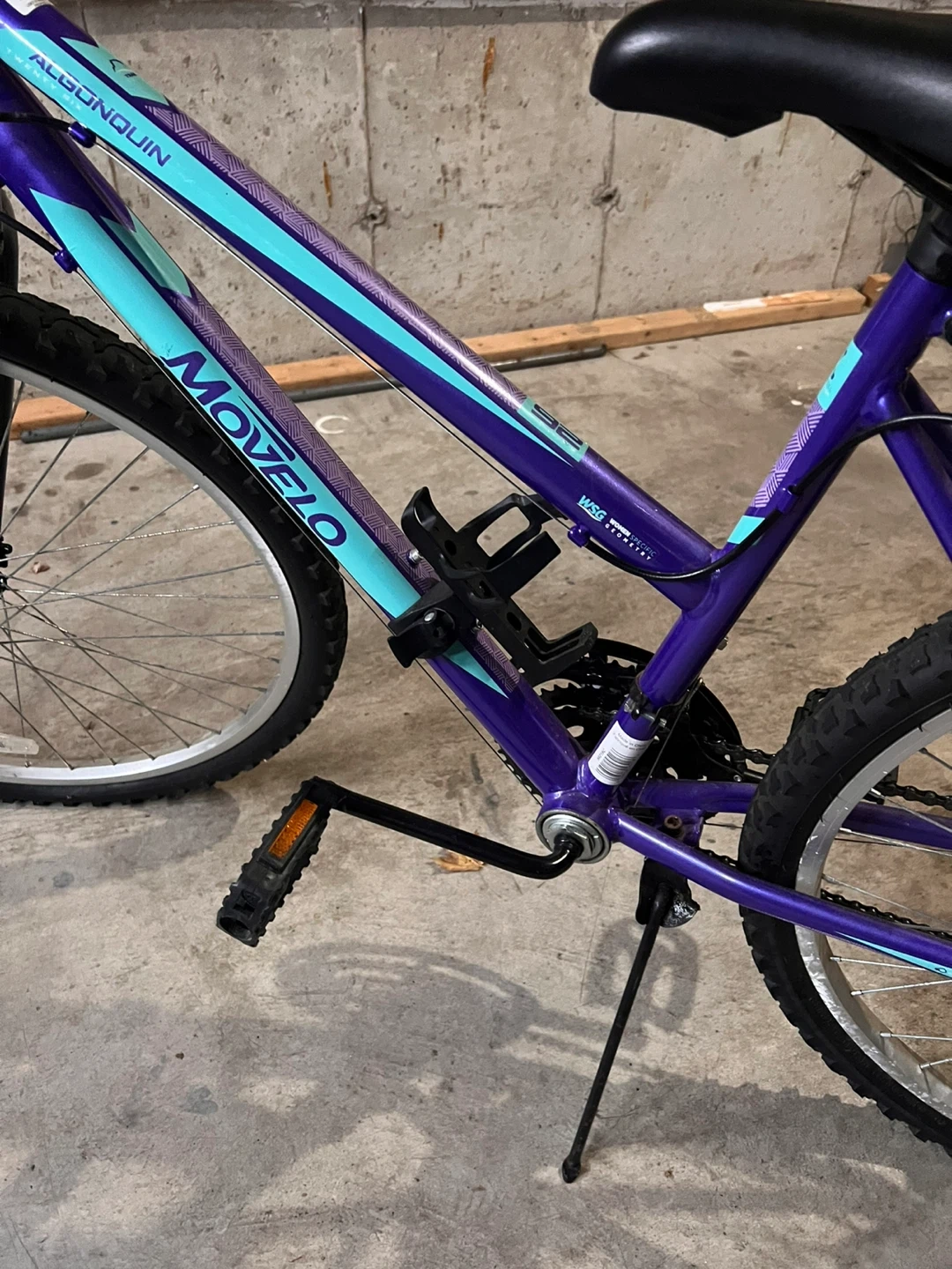 This is a purple Movelo Algonquin mountain bike. It's a Youth specific geometry model, perfect for recreational trail riding. The bike has 26 inches wheels and a durable frame.